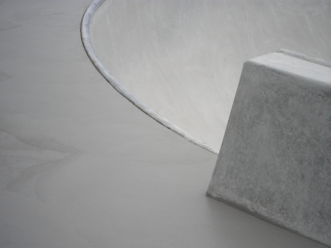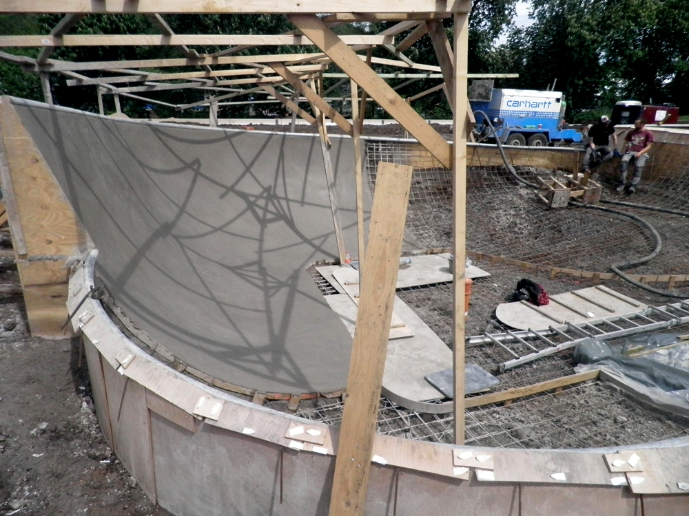 Something strange between a mini and a kidney pool. Around the bowl there will be some flat and curbs to push around and skate the back walls of those three elevators. It's pretty unique.This pocket with the bank at the top.was inspired by the Reedsport, Oregon Park. Airspeed build that one, they put a lot of strange transition and a lot of banks at the top of their quarters, so it is more like a ditch or something. The bank turns in to a transition pocket. Only the facewall is banked out, like a burnside bank."Don´t worry, those bumps under the coping that you see, they´re all gone, it´s just in between in the process.. it´s gonna be all smooth!"