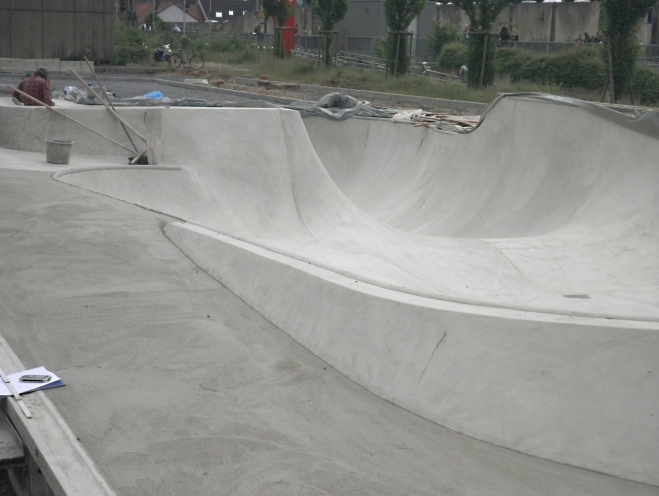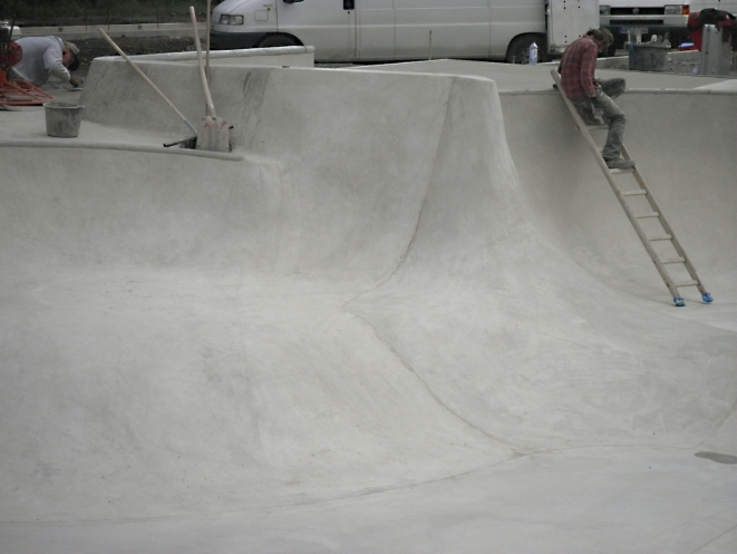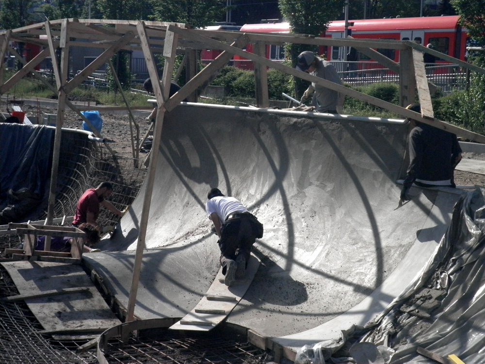 “Eitorf’s skate park’s corners are currently being filled with concrete. This little 300 square meter area is packed to the brim with unique designs. The kidney deep-end has a baby vert pocket, the miniramp part ends with a kind of burnside bank corner and a micro shallow end. Our team is currently defining the final shape and at the same time dealing with the off and on spring time rain. We’re making big steps.” – Matt Grabowski