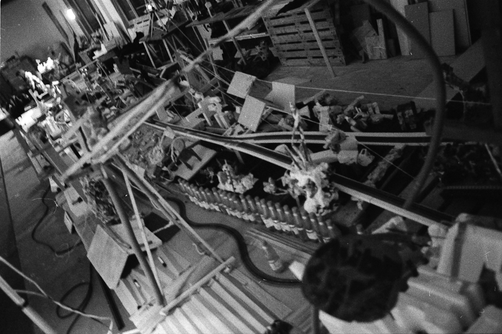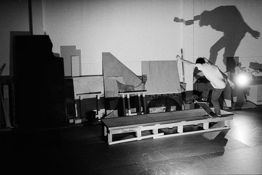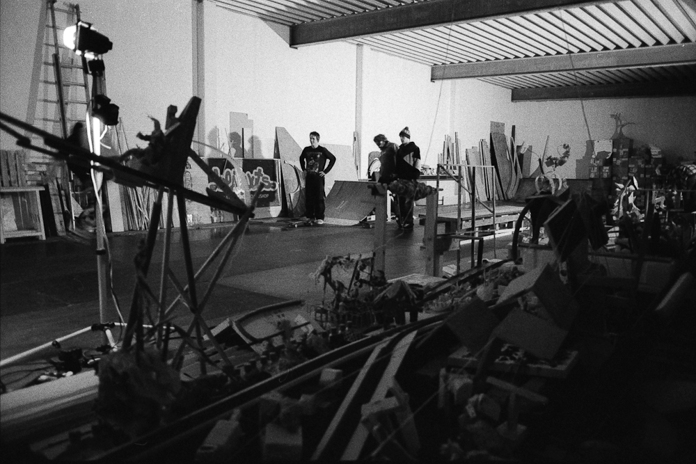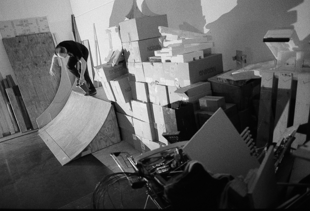 When he moved out and there still was no other opportunity for indoor skating in sight in winter 2012/13, he teamed up with local artist Jakob and managed to organize an abandoned store in a suburb, just above Jakob’s gallery Art.BuZZ’l. There he could place some obstacles from his flat (at least until a new tenant appears). Some plywood plates were laid and the obstacles rebuilt, Jakob installed a giant model-railway-landscape made of garbage and we had a new makeshift indoor skatepark. So over the last few months some good sessions, an ongoing battles of S.K.A.T.E (youtube.com/user/tintrashers) and a couple of funny events at the Art.BuZZ’l took place there…