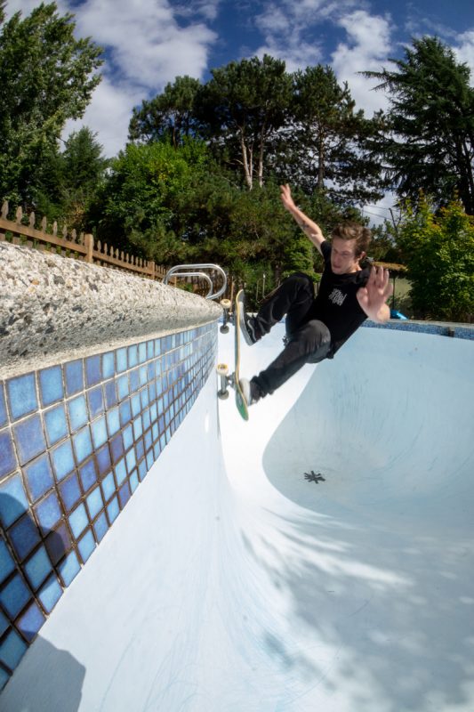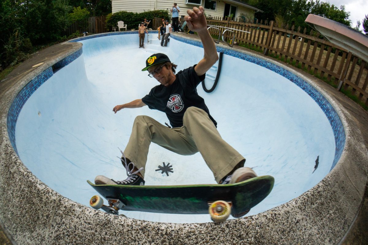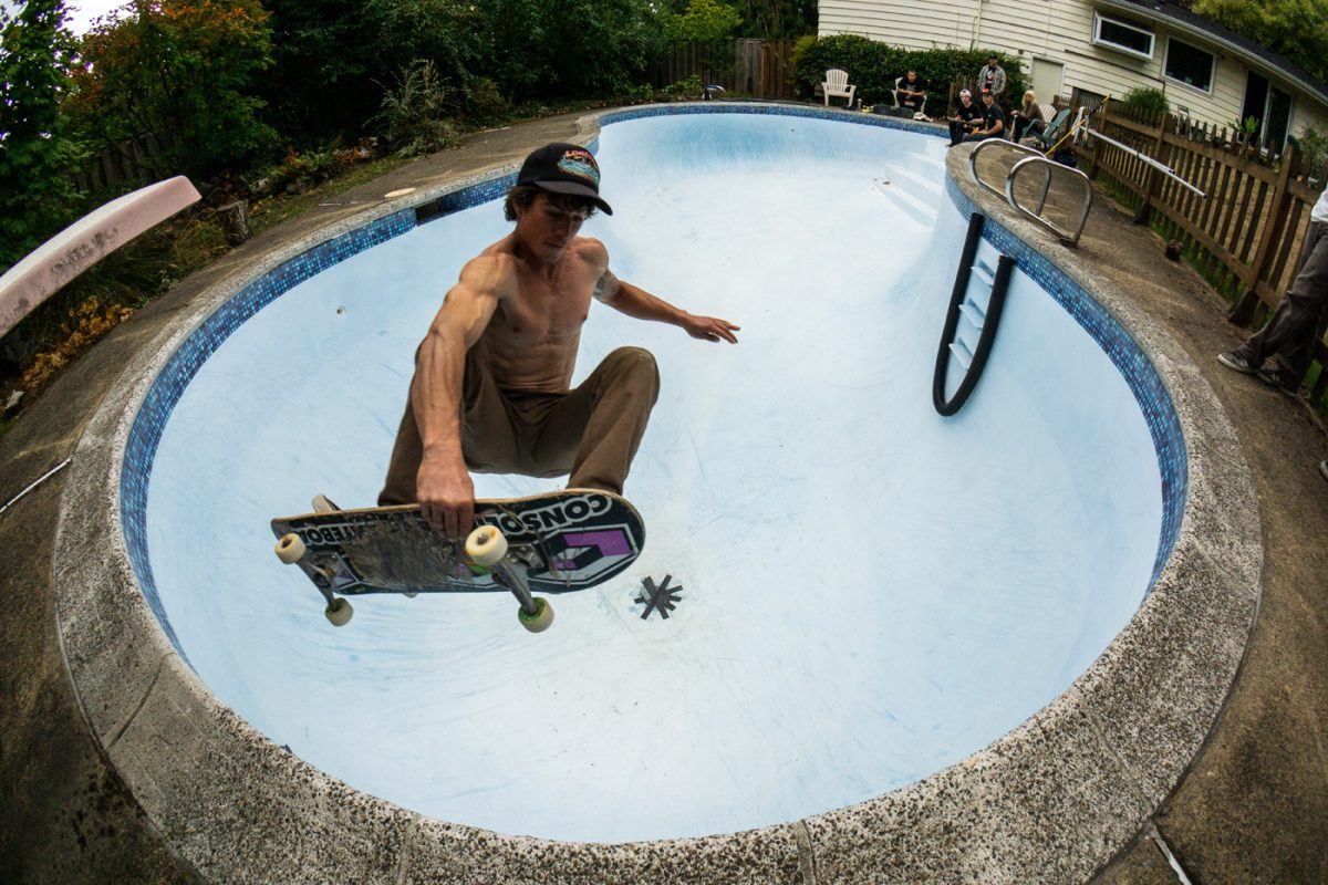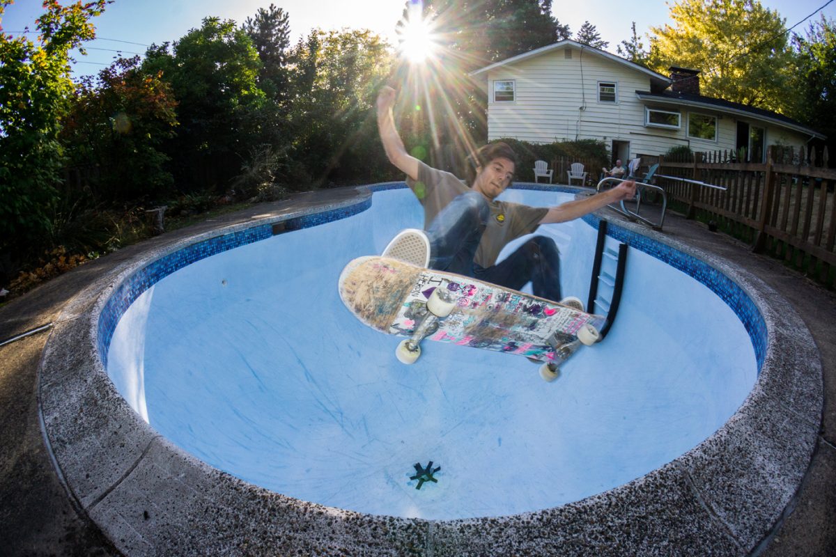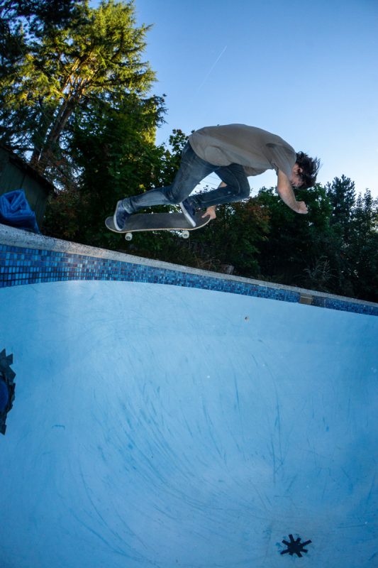 Pools in the Pacific Northwest are hard to come by, but they do exist. Rain consistently deteriorates the coping, and the riding surface gets rugged. Shrunken Head Skateboards owner, Justin, brought me to a pool his friend owned and once I met him I hit it as much as I could. Luck for us this pool was in great condition, had great tranny and was a permission until the winter rains came rolling in. The stars were all aligning on this one. We got a few big sessions fired up but by far the gnarliest session was Max Clark skating the pool solo. They don’t call him “Danger Clark” for nothing. Now, the pool is filled with water and I’m stoked I got a piece of the action.