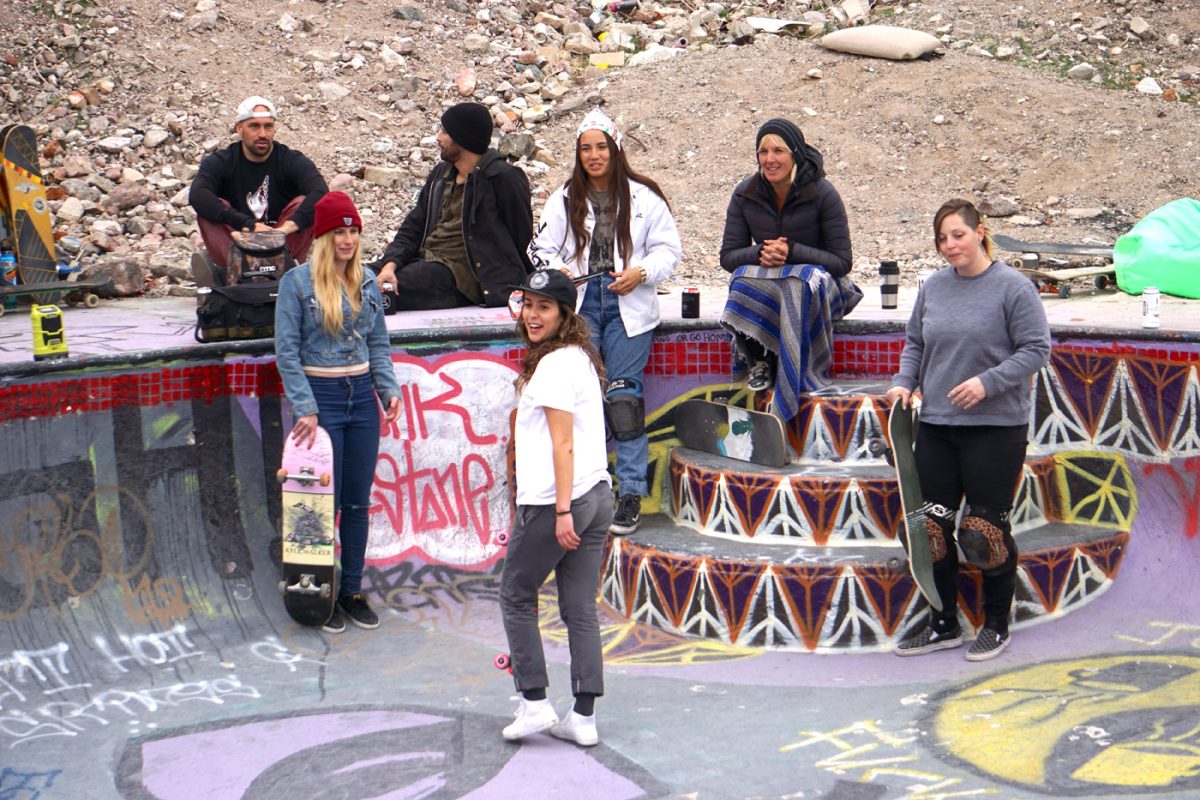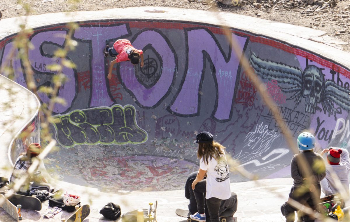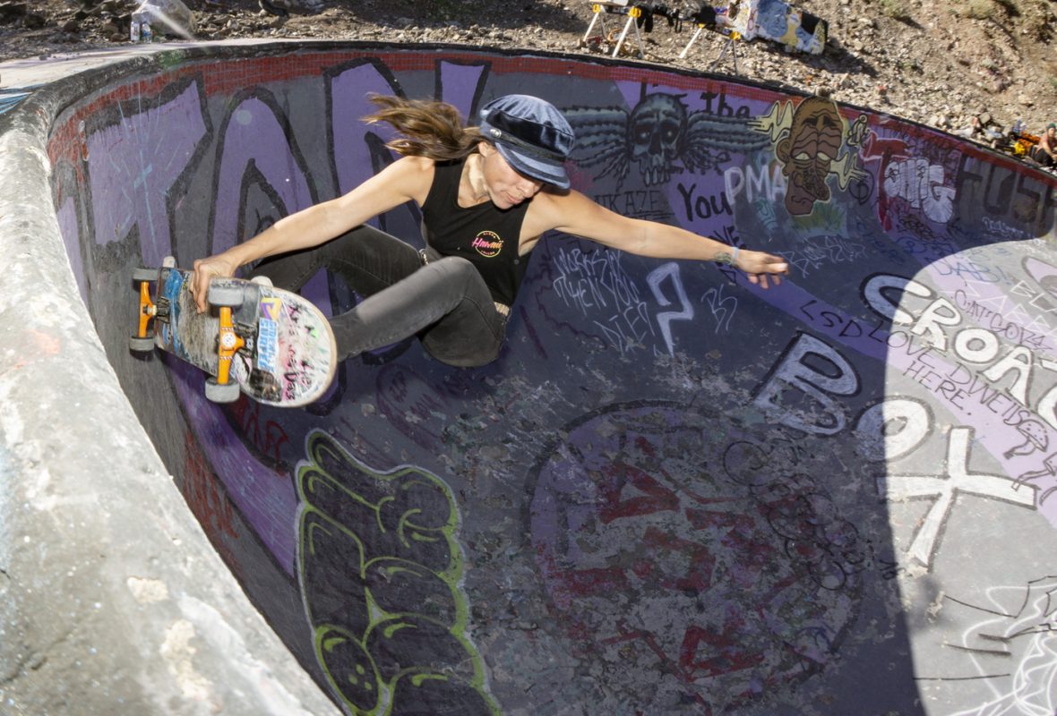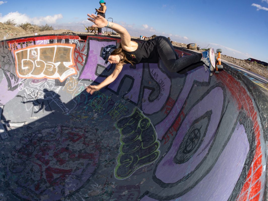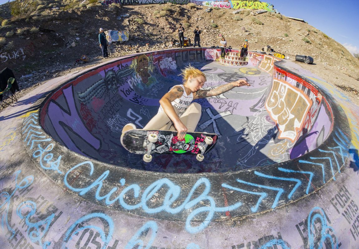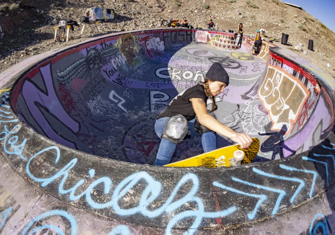 This year ‘Las Chicaz‘ had their gathering at the one and only Nude Bowl in desert hot springs. All crews had their tents pitched up and got ready to shred. On the first day during the day the skate conditions were favorable, but on the second day the afternoon clouds rolled in and light droplets of H2O started to come down and were persistent all through the night. At the crack of dawn the rain had gone away leaving the bowl with a considerable amount of rain water. Bucket and garbage can detail started the duty of extracting water and after several hours of hauling buckets and garbage, can loads of water and drying the bowl with blowers and blankets , “las chicaz” proceeded to pay tribute to this iconic skate spot.