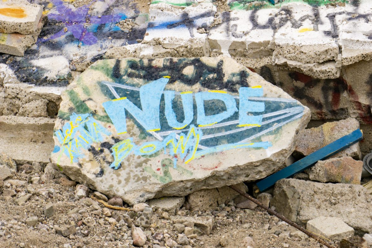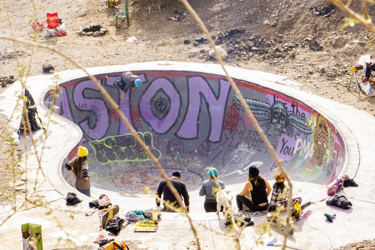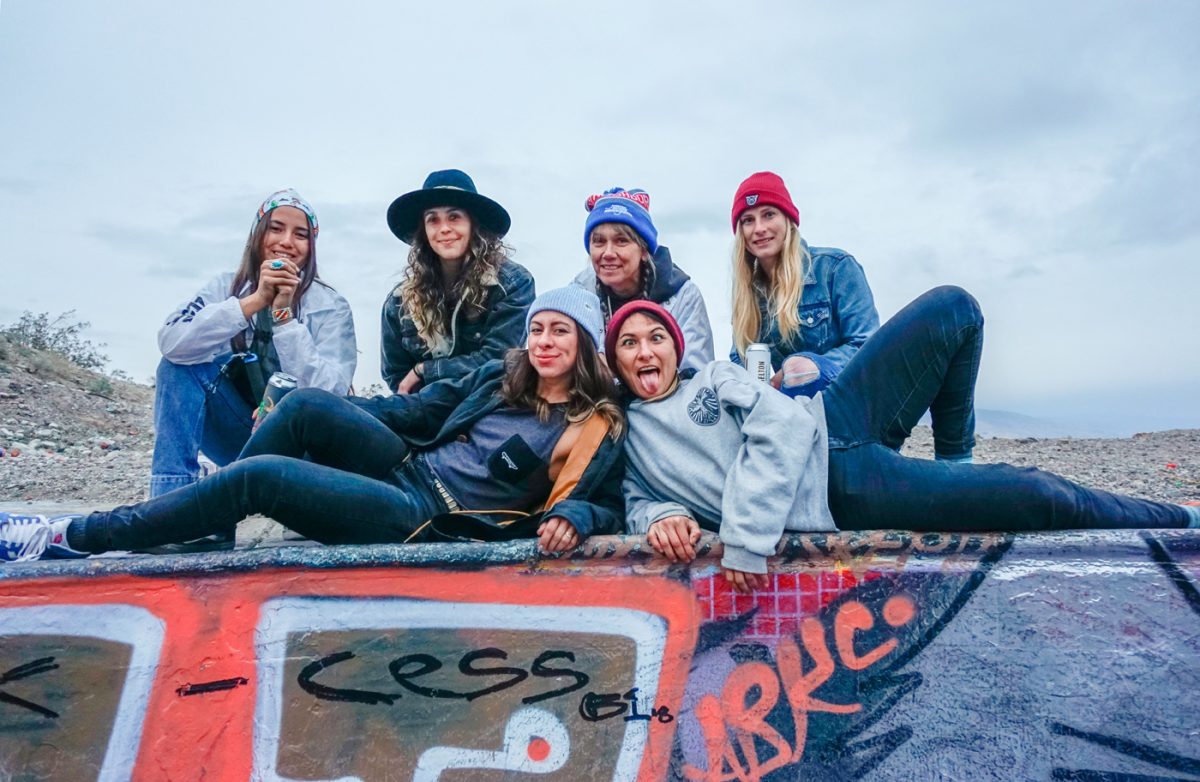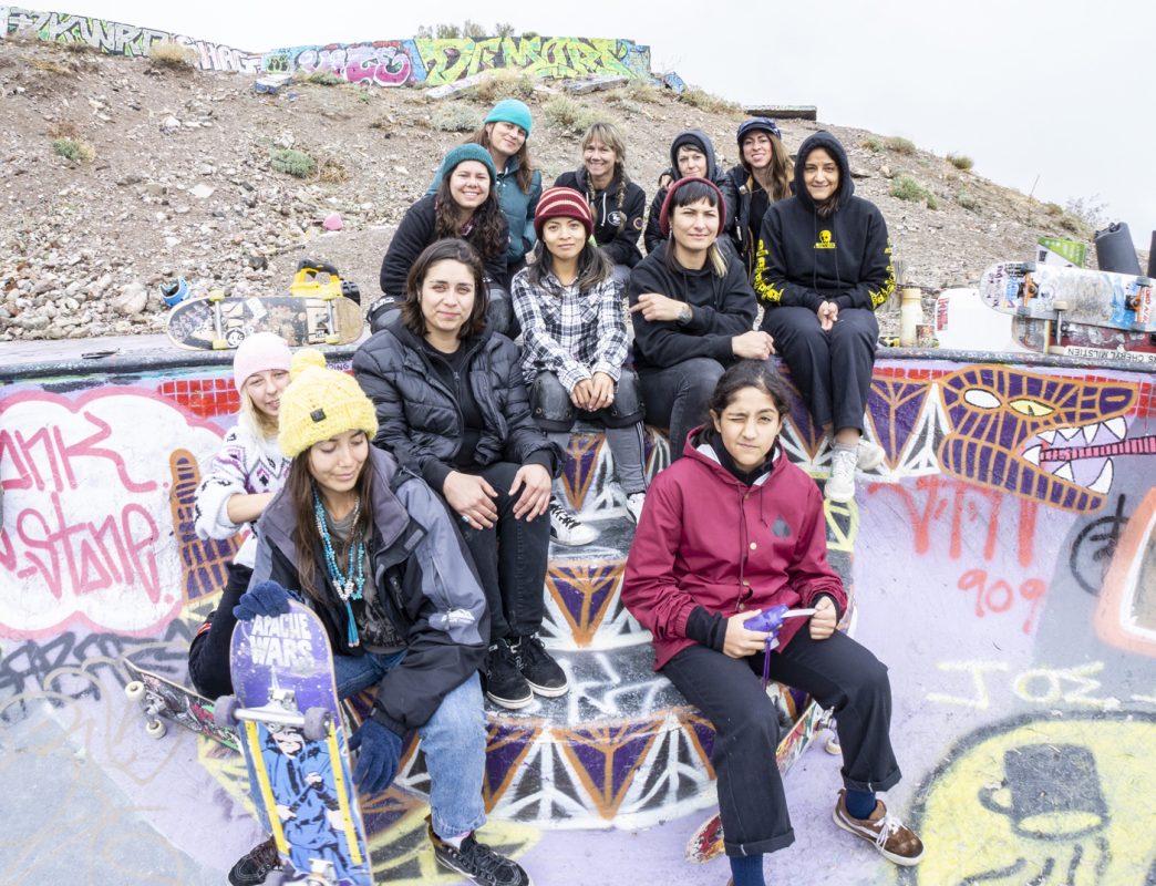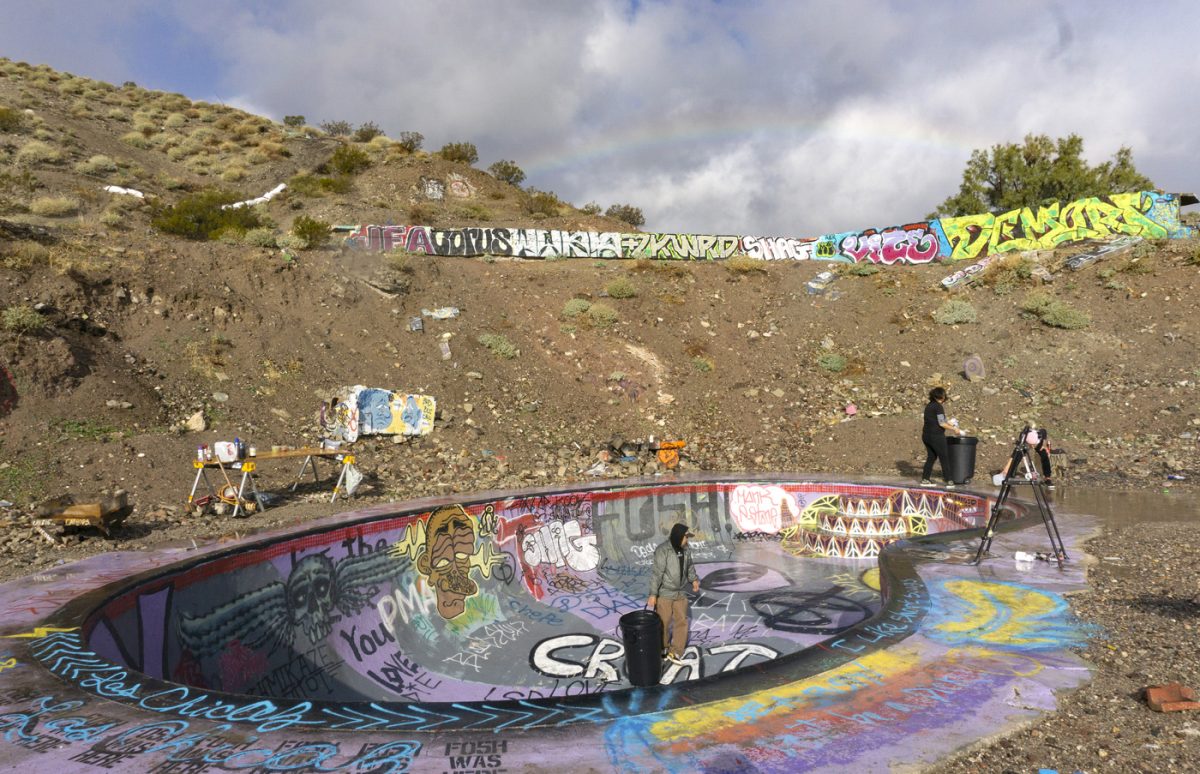 This year ‘Las Chicaz‘ had their gathering at the one and only Nude Bowl in desert hot springs. All crews had their tents pitched up and got ready to shred. On the first day during the day the skate conditions were favorable, but on the second day the afternoon clouds rolled in and light droplets of H2O started to come down and were persistent all through the night. At the crack of dawn the rain had gone away leaving the bowl with a considerable amount of rain water. Bucket and garbage can detail started the duty of extracting water and after several hours of hauling buckets and garbage, can loads of water and drying the bowl with blowers and blankets , “las chicaz” proceeded to pay tribute to this iconic skate spot.
