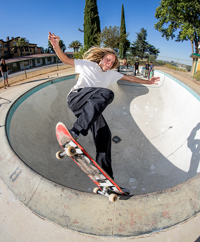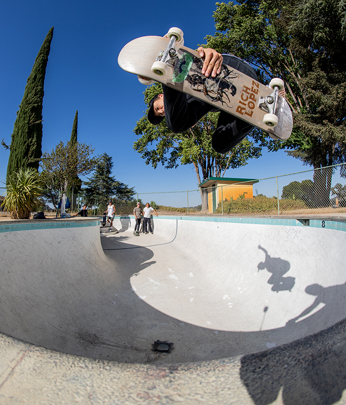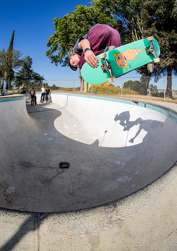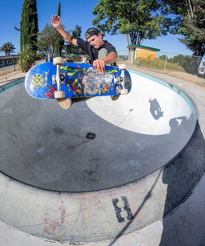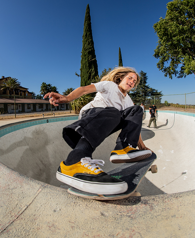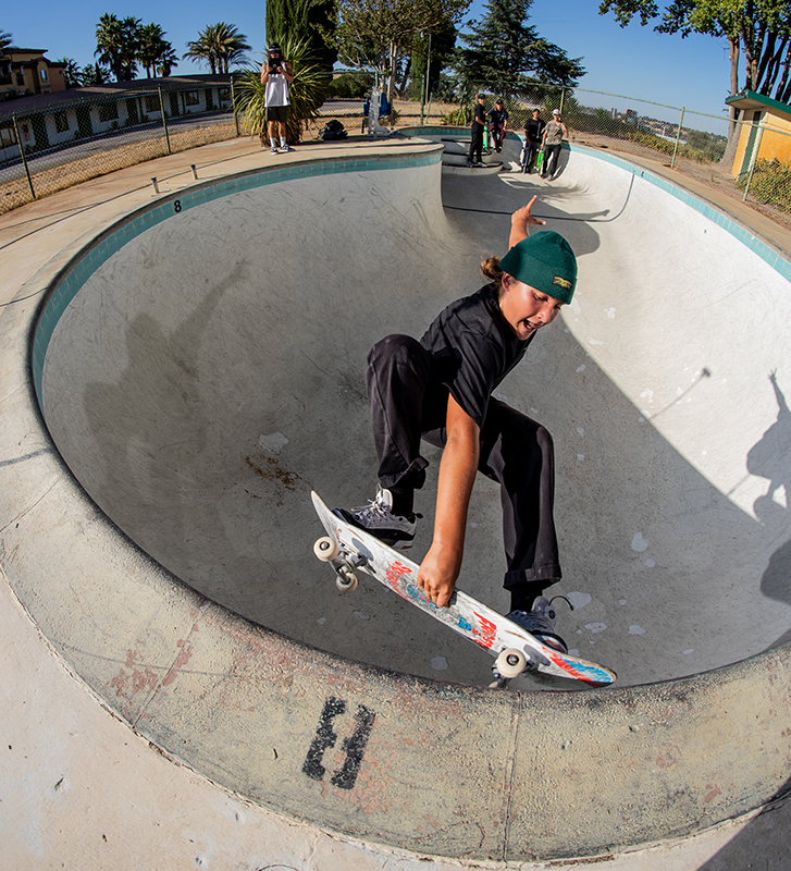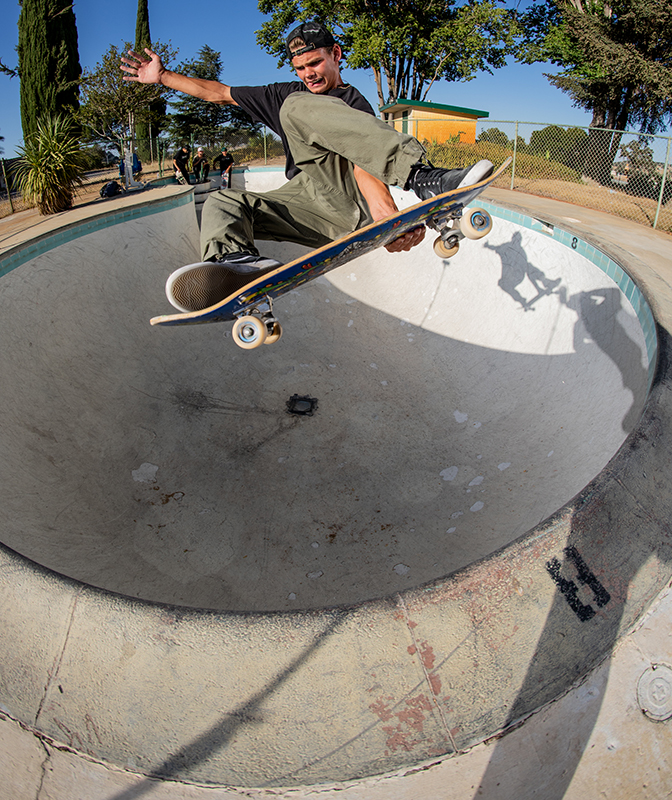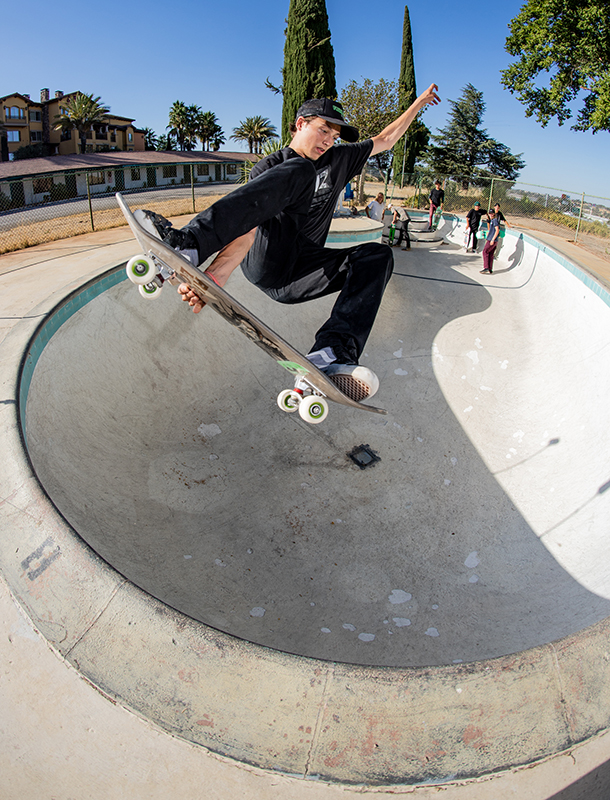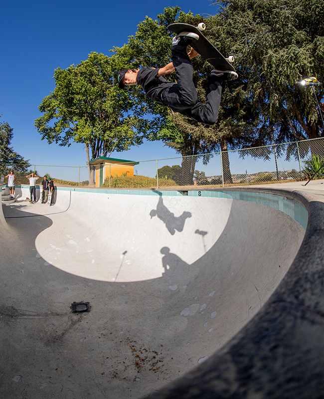 It’s an easy 100 degree out when the guys start the session. Matt takes one run and starts throwing up some backside airs, David answers back with a nose grind, and Christian who says this is is first backyard pool begins working on a frontside nose bone.