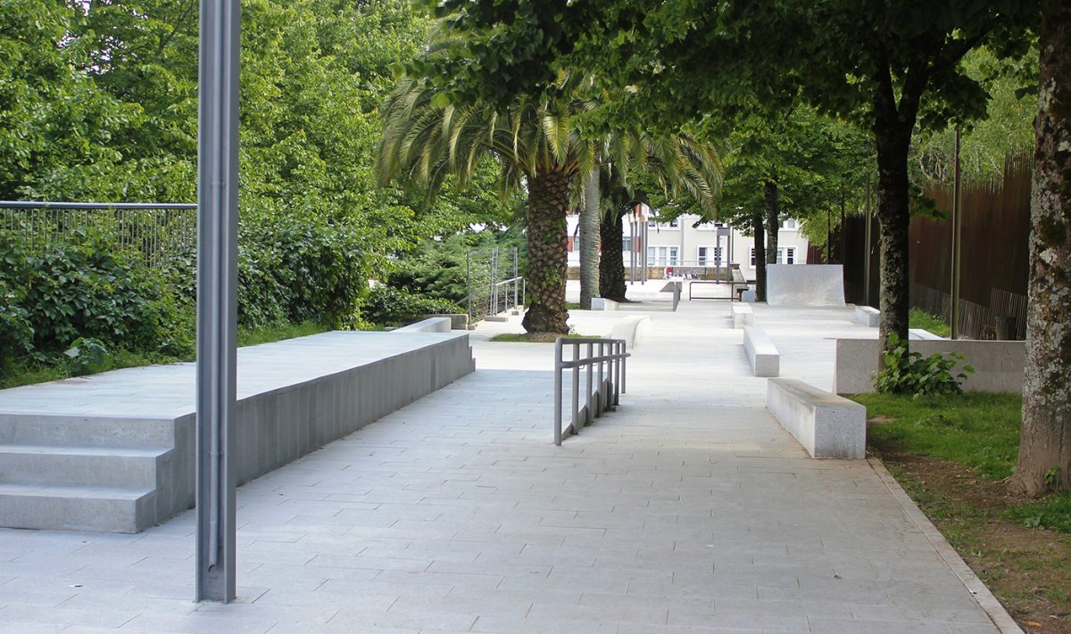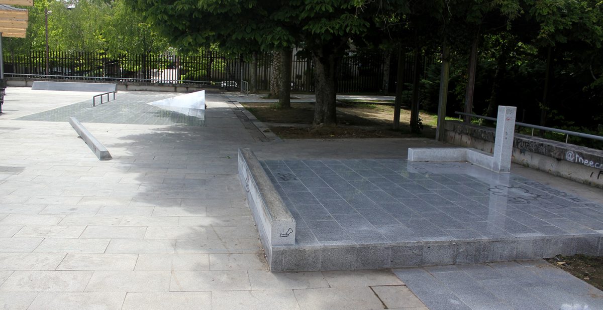 In June 2019 a new skate area opened in Santiago de Compostela, northwest of Spain. The space was adapted from the previous terrain so ended in two connected areas, the “c” (with granite curbs and quarters, stairs and rails ) and “Plaza Mirador” ( with bank, planter, slappy, pyramid, manual pad and flat rail) but this one is only skateable after 8pm because there are office workers under that part of the spot – except for weekends of course.