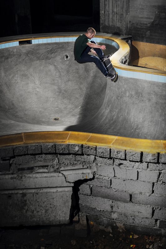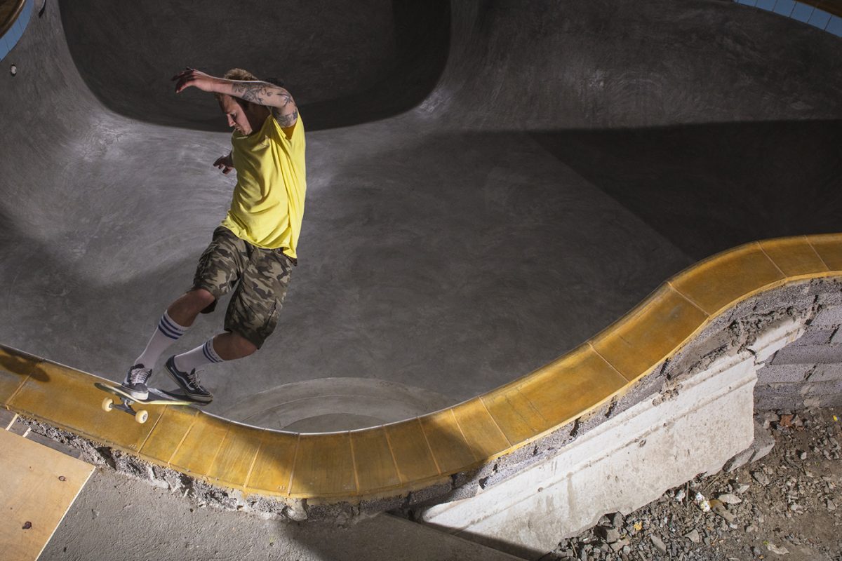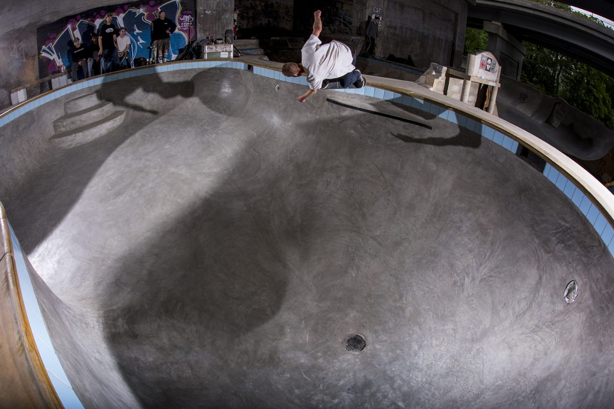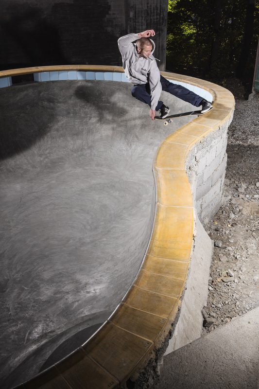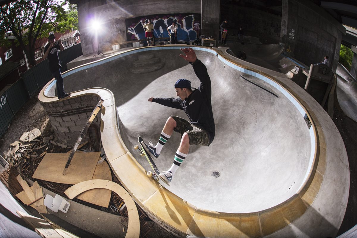 Below you can enjoy the two masterminds, Leo Ström & Fredrik “Fresh” Gustafsson, playing around in their latest creation – the most insane “backyard pool” Stockholm has ever seen. A true beast with tons of vert and steep corners but yet an ever so fresh pleaser to the eyes; huge deathboxes, large cyan tiles, yellow cooping blocks and a baby smooth surface, all poured in one go. With all the extra details such as the drain in the deep end, pool light, love seat and even water valve caps on the walls it’s as close to the real deal as it gets.