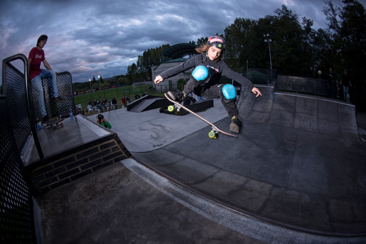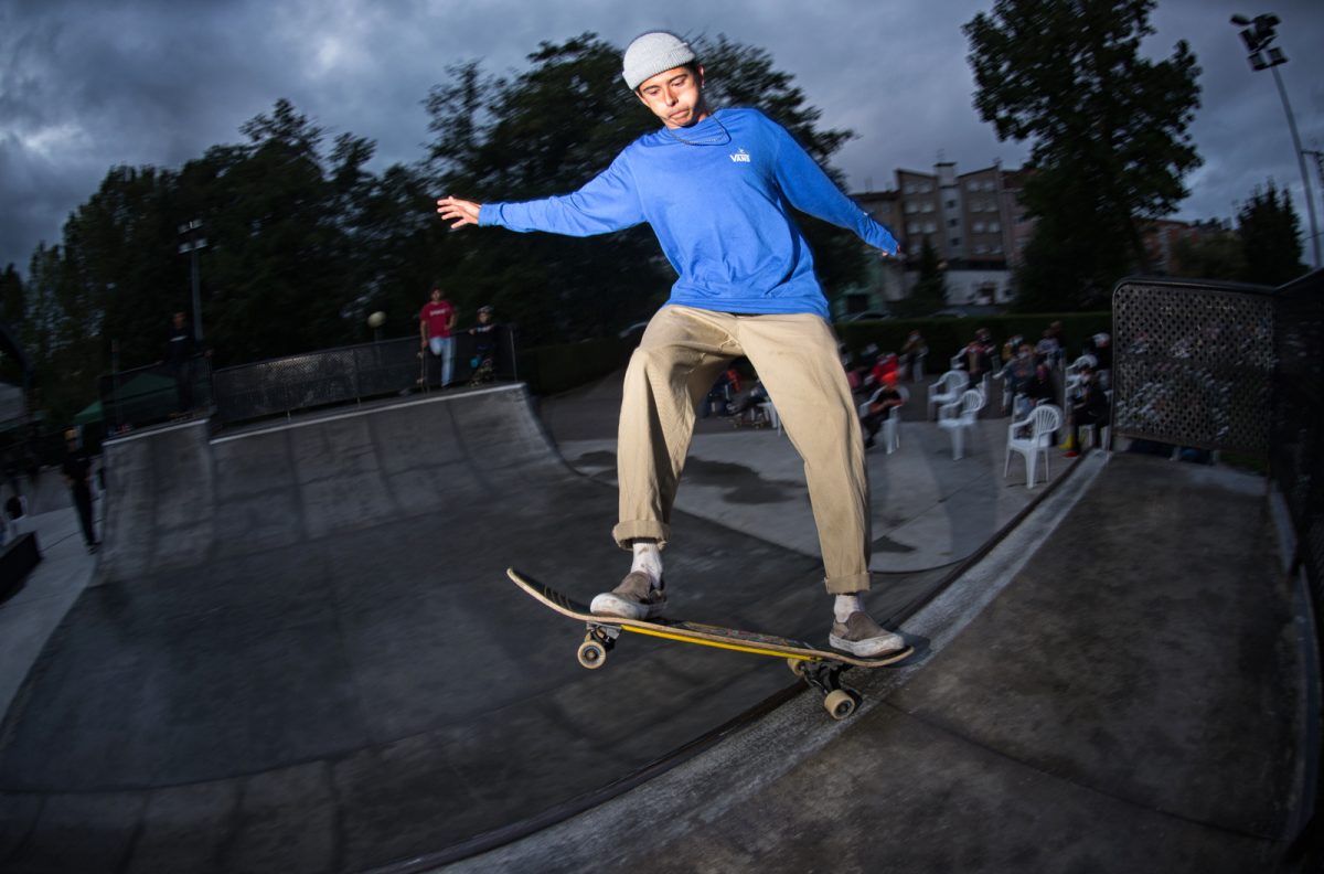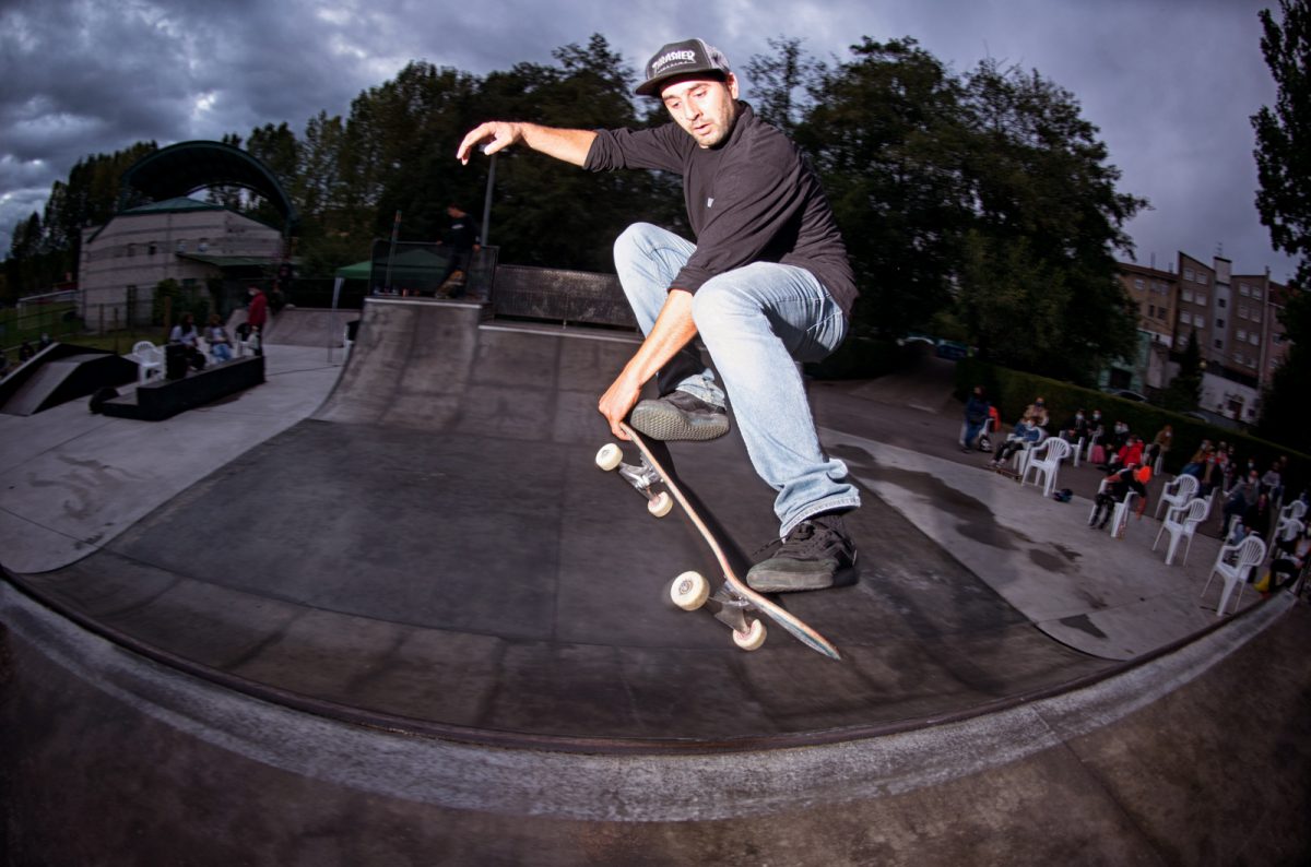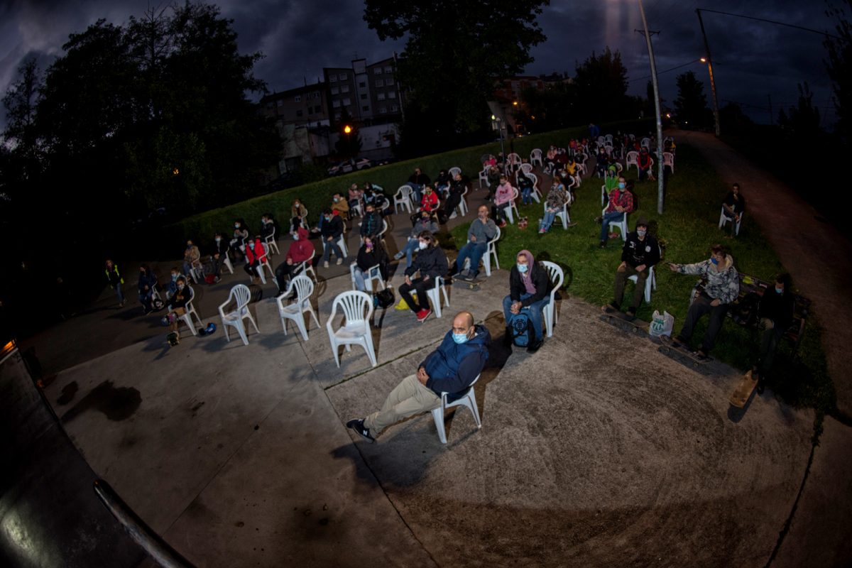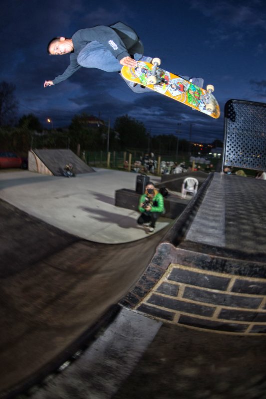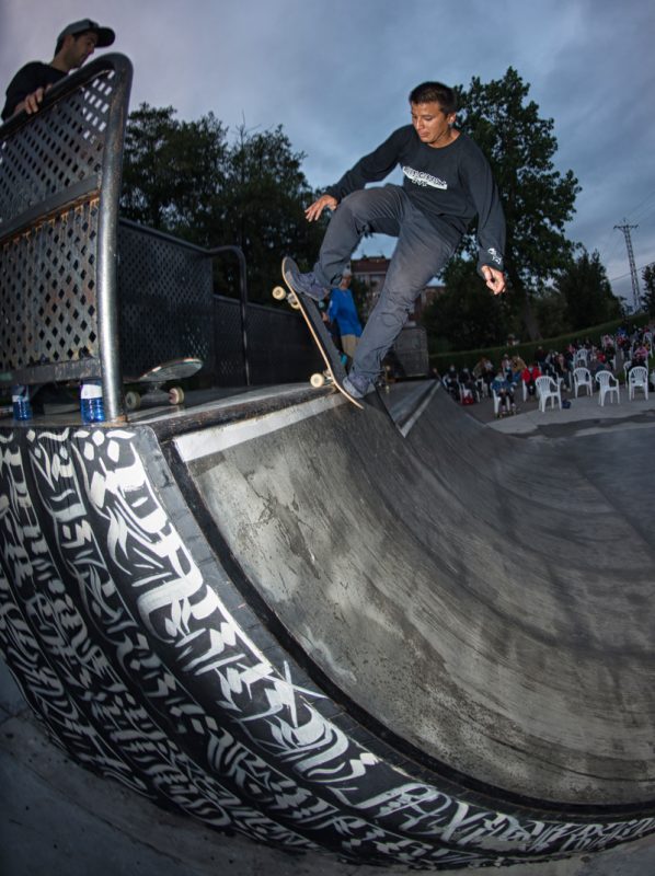 On October 3rd, a special corona version of the annual Gochu Skate event took place in Noreña, Asturias, a small town known for it’s pigs and Gochu fiesta where 100s of kilos of pork are given out to the inhabitants of the town for free. This year, because of the COV-19 pandemic, only five skaters could be part of the skateboarding action – the audience were limited and social distanced, contact tracing preparations were made with names and phone numbers for all attendees and participants, and of course, as is the law in Spain, mandatory masks for everyone, except the skaters while on the ramp. It rained all weekend but stopped moments before the demo started. Que suerte!