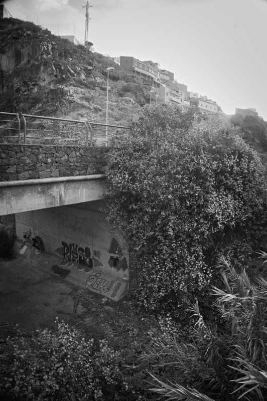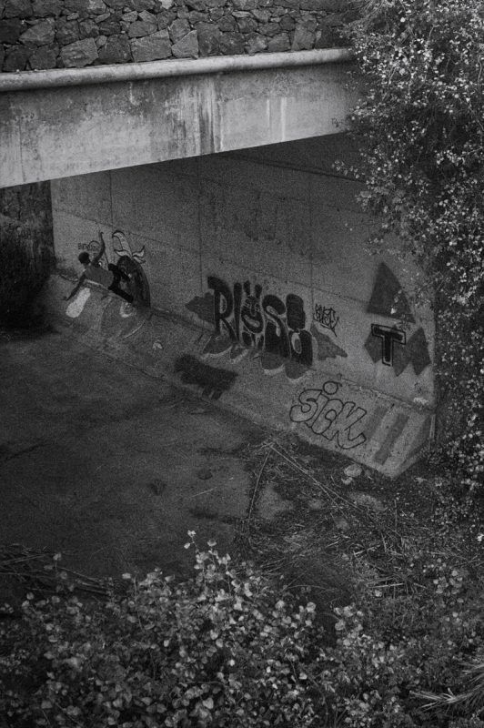 A day before I left the island we went there and found it. A pretty hard bank / wallride with super rough floor and a short three meter run up. My idea of doing a wallride fell apart the moment we jumped down the canyon, but I had the idea of shooting a wallride from an angle where you are able to see the canyon, the houses above the street, and of course the bridge and somewhere down there, somebody on a skateboard, doing something in this wild place.