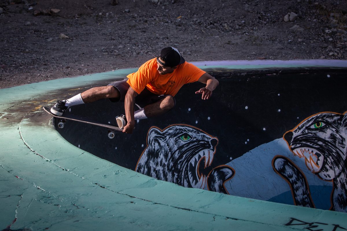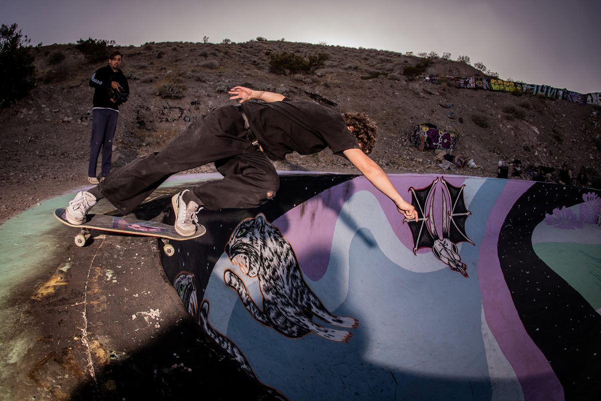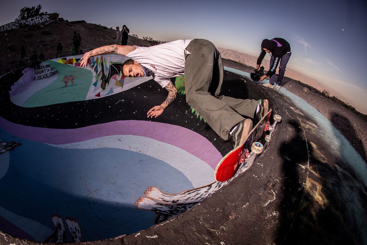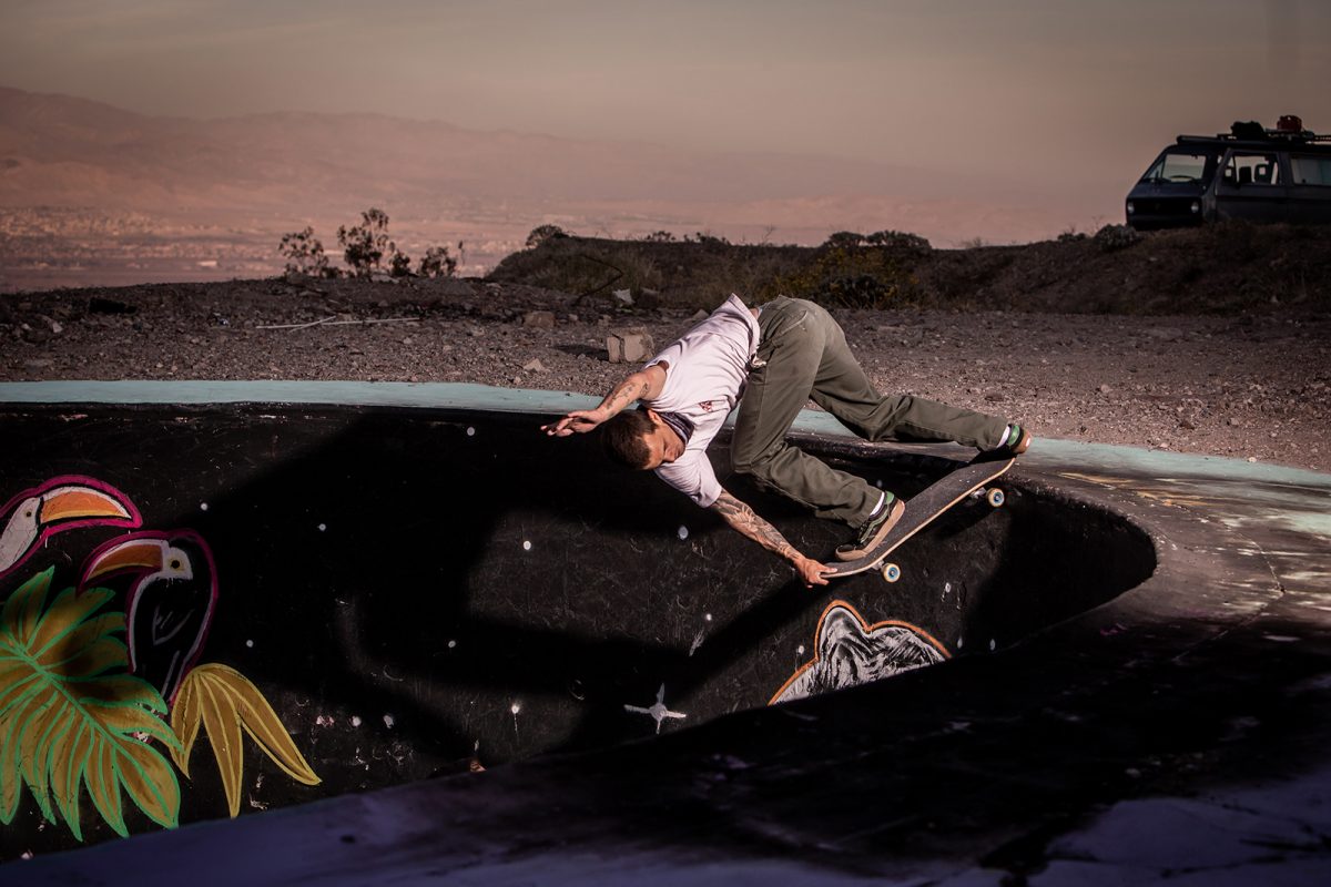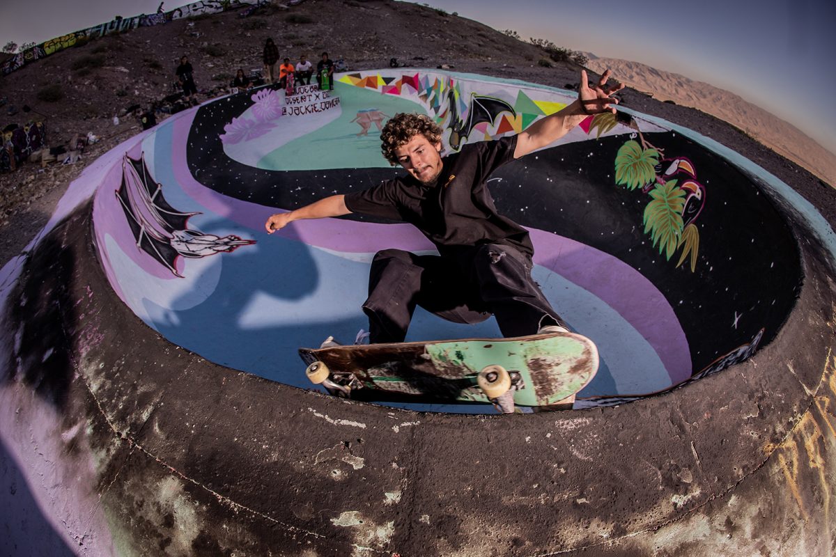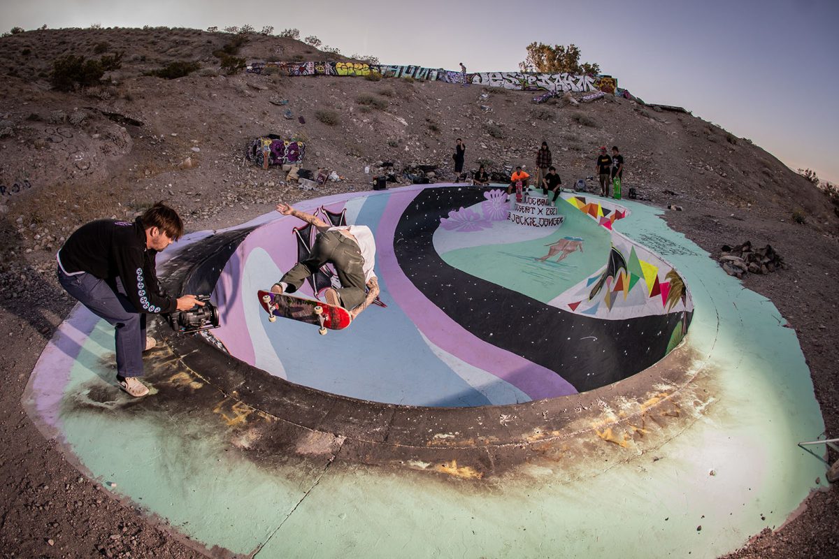 One of the best things about skateboarding is how, even in the middle of a desolate expanse of desert at an abandoned pool, you can meet a group of skateboarders who begin as strangers and end as good friends. Those who have been there know that the unmarked, unpaved road to the Nude Bowl is not easy to traverse, especially not with a sizable group stuffed into Andiey Lerma‘s front-wheel drive Chevy Impala. On a mission to film a few clips for Nic Rivera‘s upcoming skate video with Cyrus Read, we arrived at the Nude Bowl to find Raymond and his friends there in the middle of a camping trip. The bowl had been freshly painted the day before with a full cosmic mural by Jackie Danger, serving as an epic backdrop for the ungodly amounts of stoke that would soon follow, as well as a tribute to our recently fallen brothers: Jeff Grosso, Joe Hammeke, Sasha Steinhorst, and Jonas Wray. Each group took turns grinding, slashing, rocking, and ultimately lighting up the bowl until our group and their group had become one indecipherable mesh of skateboarders and homies, exactly the way a great skate adventure should be.
