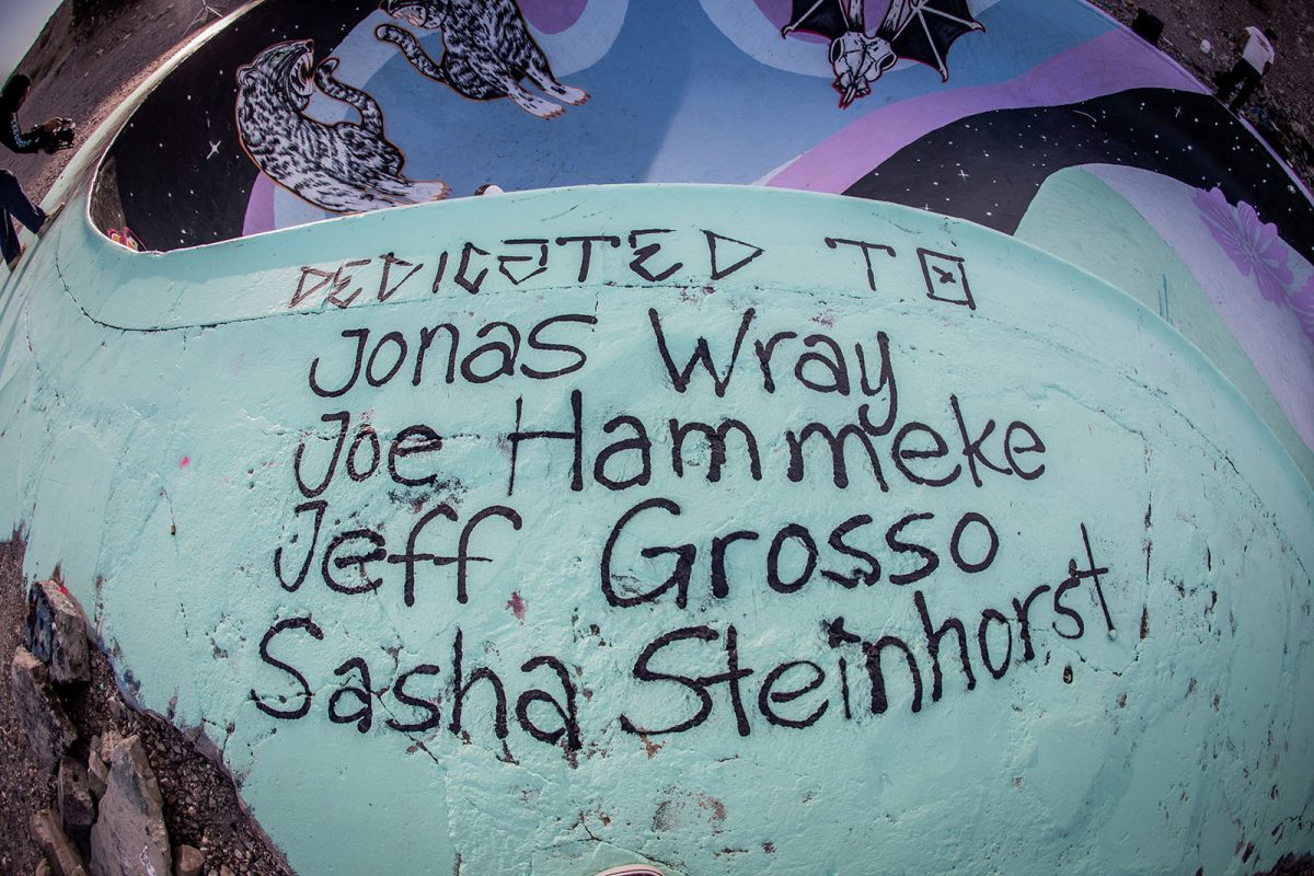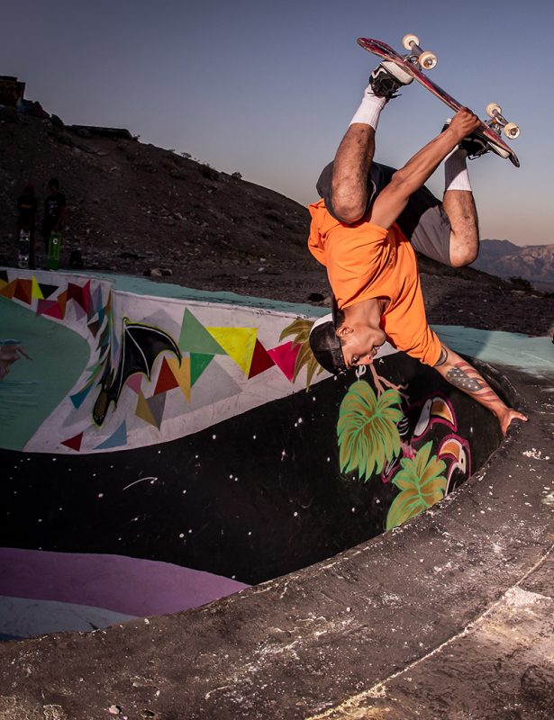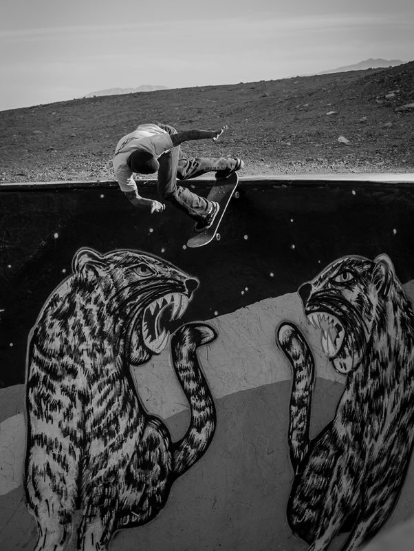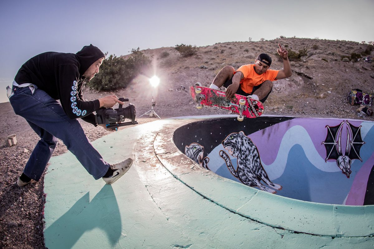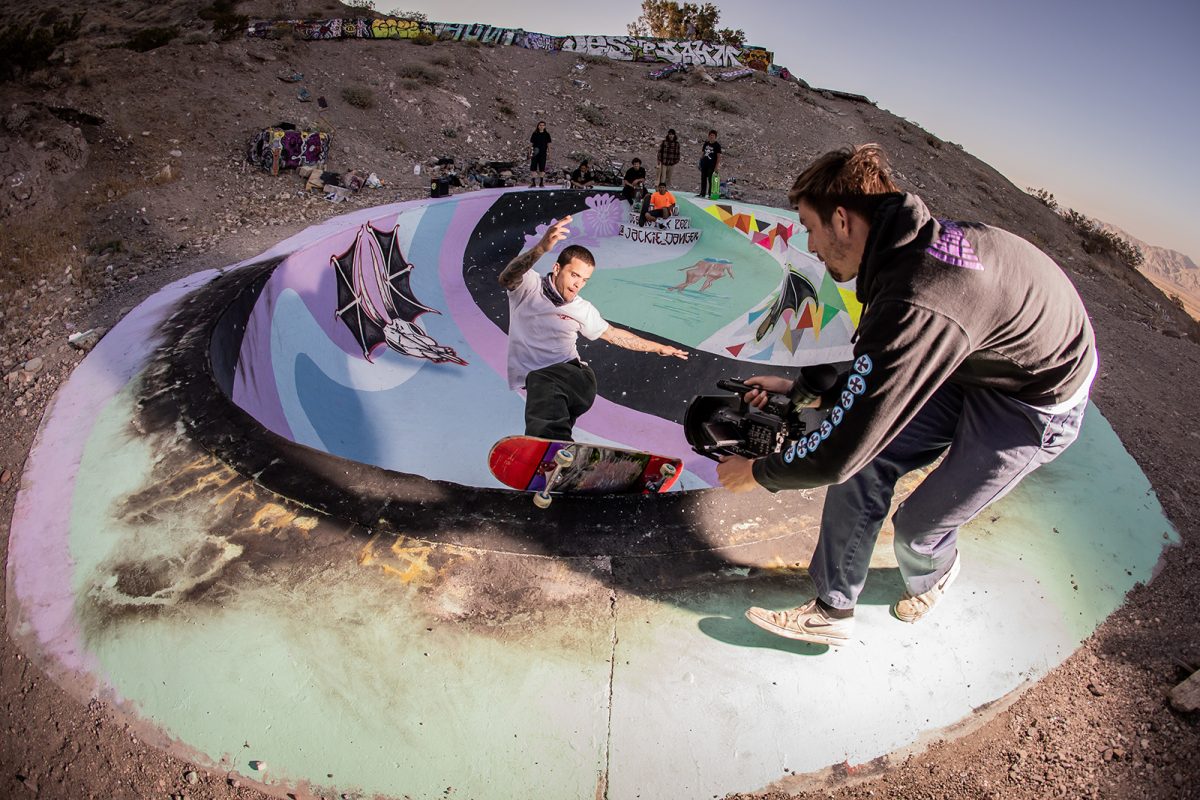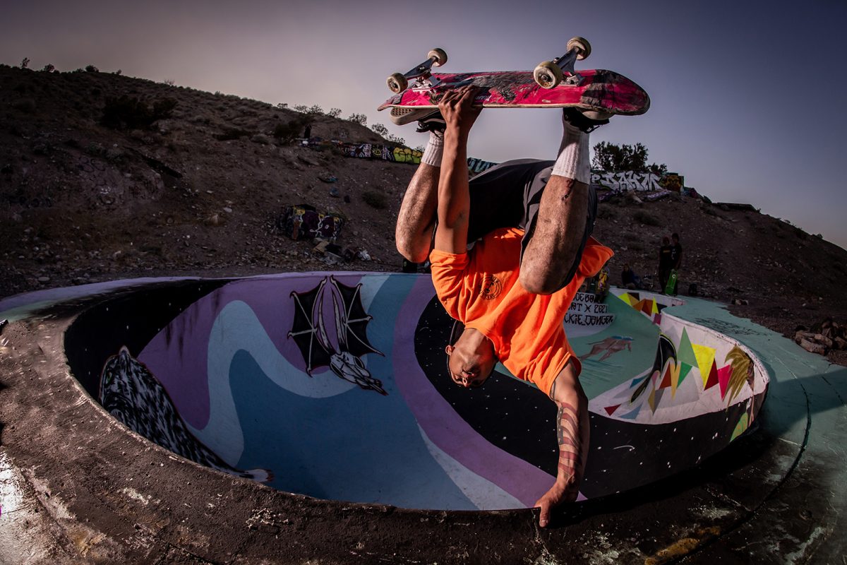 One of the best things about skateboarding is how, even in the middle of a desolate expanse of desert at an abandoned pool, you can meet a group of skateboarders who begin as strangers and end as good friends. Those who have been there know that the unmarked, unpaved road to the Nude Bowl is not easy to traverse, especially not with a sizable group stuffed into Andiey Lerma‘s front-wheel drive Chevy Impala. On a mission to film a few clips for Nic Rivera‘s upcoming skate video with Cyrus Read, we arrived at the Nude Bowl to find Raymond and his friends there in the middle of a camping trip. The bowl had been freshly painted the day before with a full cosmic mural by Jackie Danger, serving as an epic backdrop for the ungodly amounts of stoke that would soon follow, as well as a tribute to our recently fallen brothers: Jeff Grosso, Joe Hammeke, Sasha Steinhorst, and Jonas Wray. Each group took turns grinding, slashing, rocking, and ultimately lighting up the bowl until our group and their group had become one indecipherable mesh of skateboarders and homies, exactly the way a great skate adventure should be.