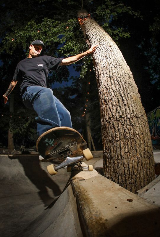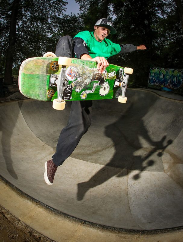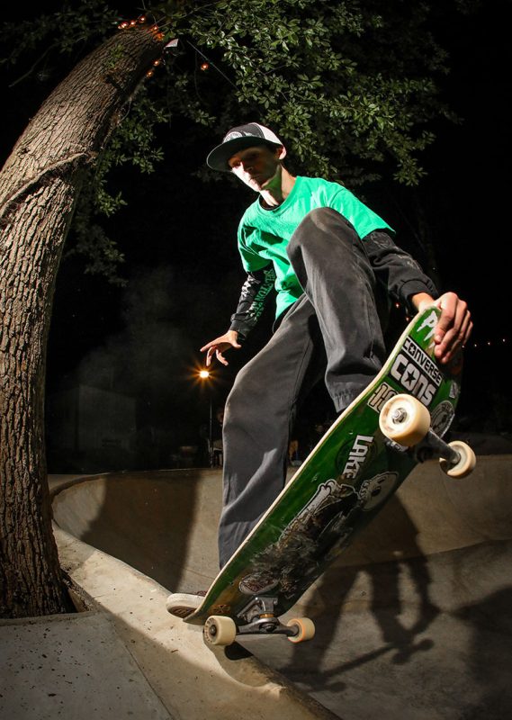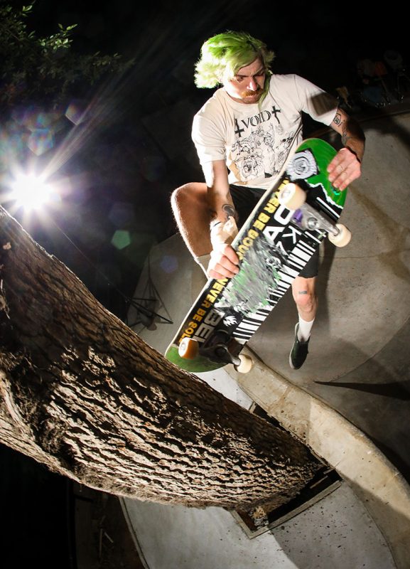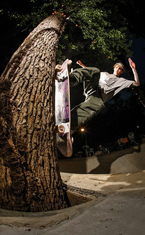 “For me it was wild to look up and see five horses and a goat surrounding the bowl. Lines were easy to find in the pool, but it was hard to stand up on a grind knowing that there was no deck, though once you got used to it, the fresh coping just flew. There are a couple of shots of me basically hugging a tree while finding a stall or planting a foot and hoping it was on the coping before jumping back in. But that shit was fun!” – Shawn Ganley