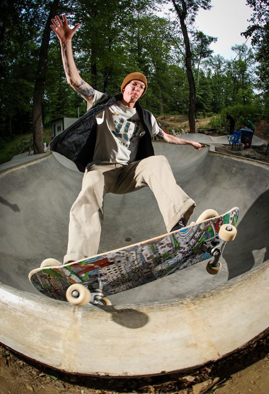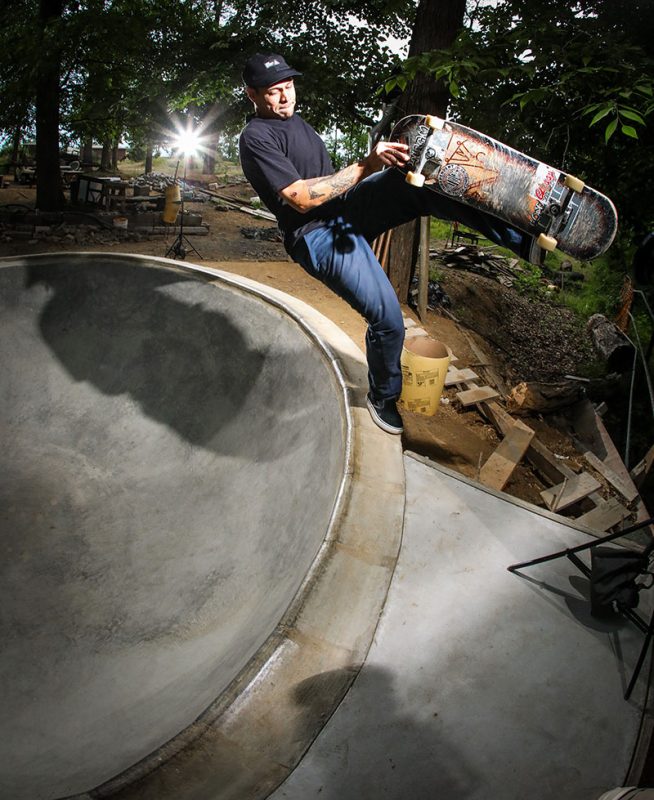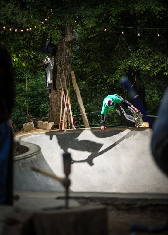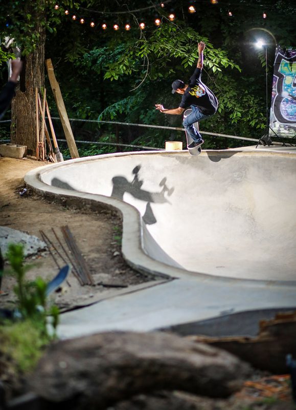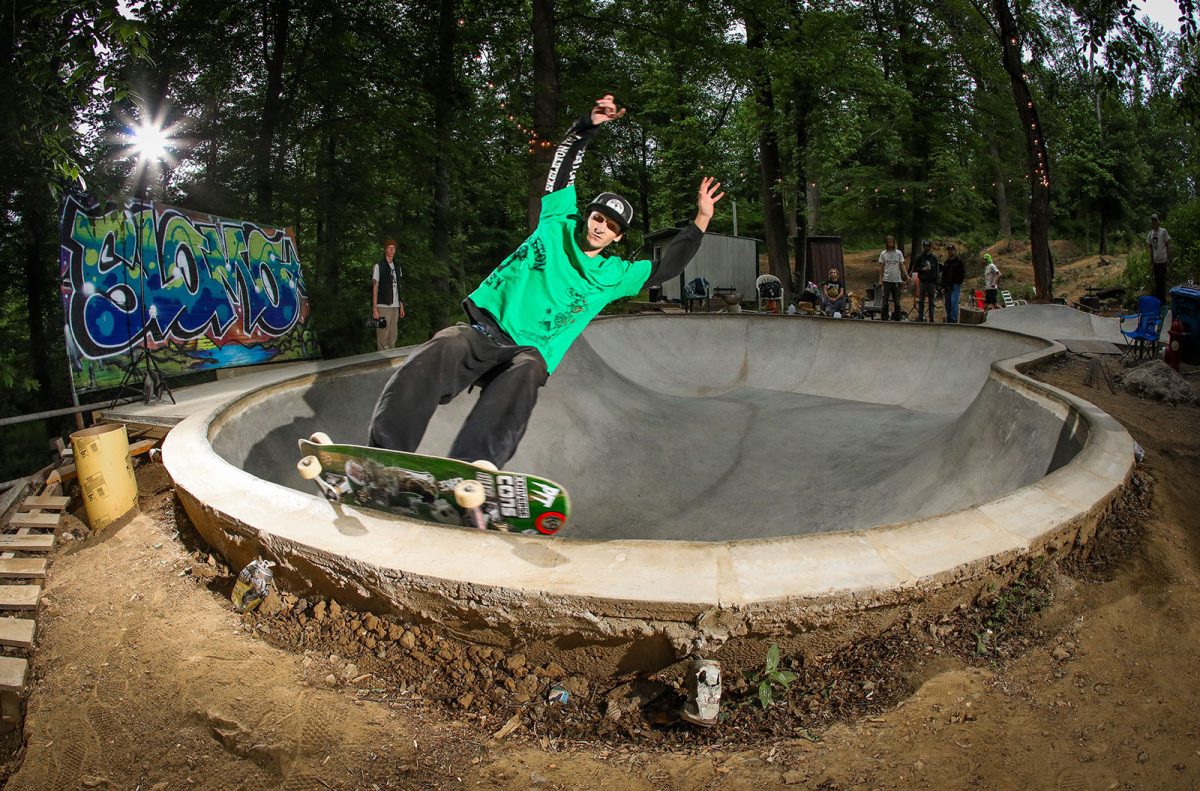 With all the conspiracy theories in the world, let me tell you about one that doesn’t involve the government or aliens; The Conspiracy Bowl in New Jersey is a backyard pool that we got to shred in a sick night session. After walking down a dirt road in a secluded area, we knew we were in the right place when we passed some concrete ramps and a giant dirt motocross area. As we approached the bowl, Bren was sweeping out the bottom and Billy was shellacking the coping for a fired up Monday night session. Justin Mondschein was super stoked to link up take some shots back in the woods with all the scenery. Bren Marra said he sometimes just likes to stare at it at night with the fire. I can definitely see why, as this bowl was super fun to skate. There was a fresh pour with the Wilkie tiles in it, Brendan Wilkie was a hometown skateboarder and it was really respectful to see him memorialized in this way. This spot just showed that skaters can build on anything, in any environment, it was literally a farm with horses and dirt and chickens. All we need is a bunch of concrete and a place to make it happen. We were fired up, in a great spot, and everybody killed it. Because of Bren Marra and the use of this place, it was a great Monday night. Finally a conspiracy worth talking about.
