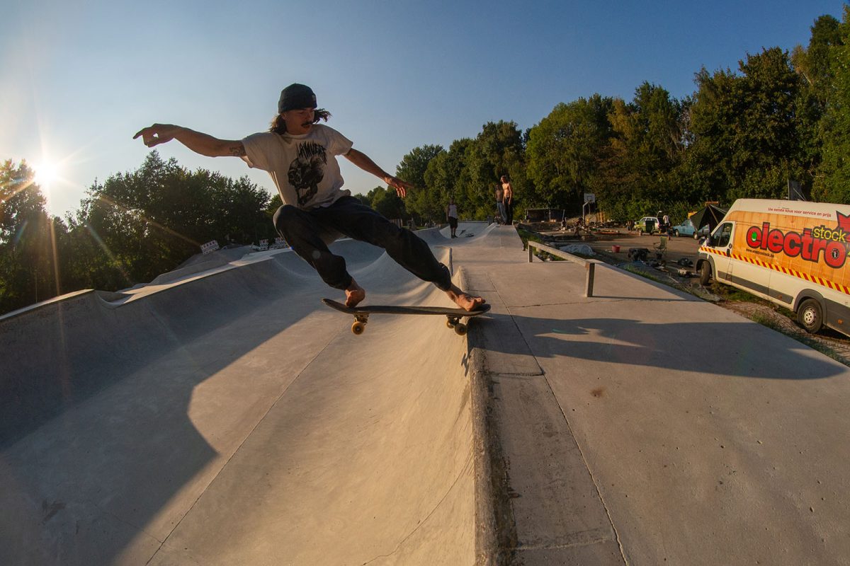 Roland from Liège is one of Belgium´s finest and has the sketchiest style ever. He always puts on a show and even his 50-50s look like suicide attempts, all the way long. (Fiehlphoto)Gian couldn`t wait for the bowl to be finished to Fs Air the channel, and it only took us two days to pour it, him a couple tries. (Fiehlphoto)Christian Neve. No-comply Pole Jam