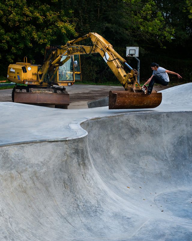 Since the ancient excavator was parked next to the basketball court the whole summer Über-Local Bela Ehmann claimed he would skate it once the bowl was finished. At our little grand opening he could make ends meet and was able to pull this frontside pivot grab while nobody dared to join him on this special session. It was probably more of a mission rather than a session.