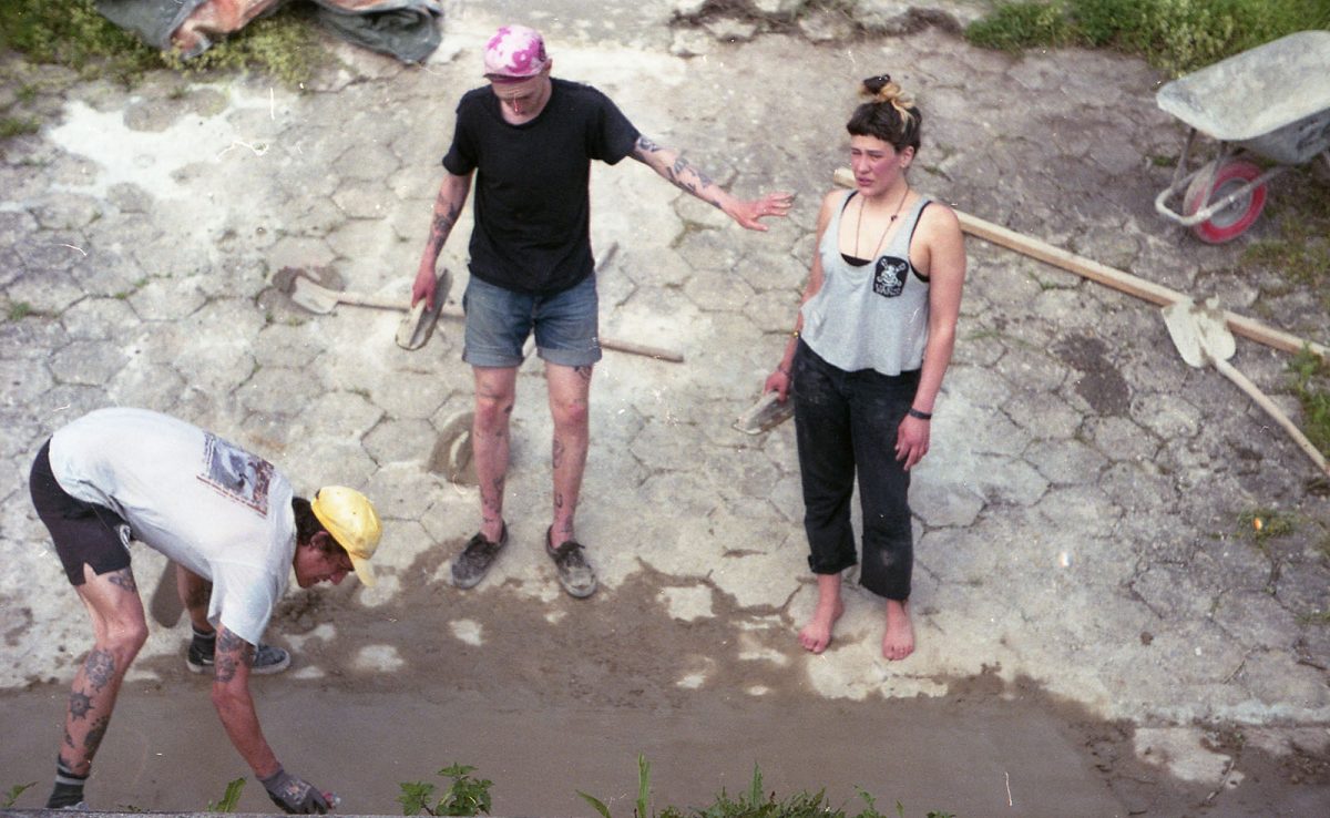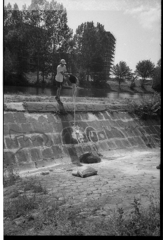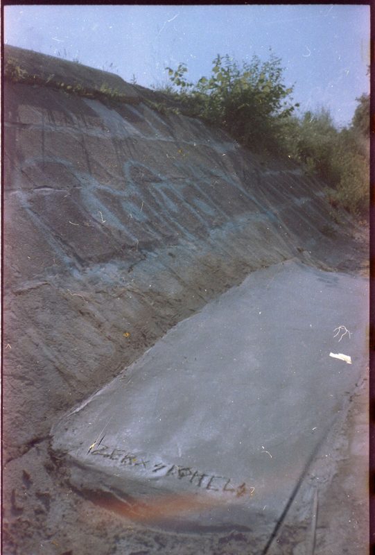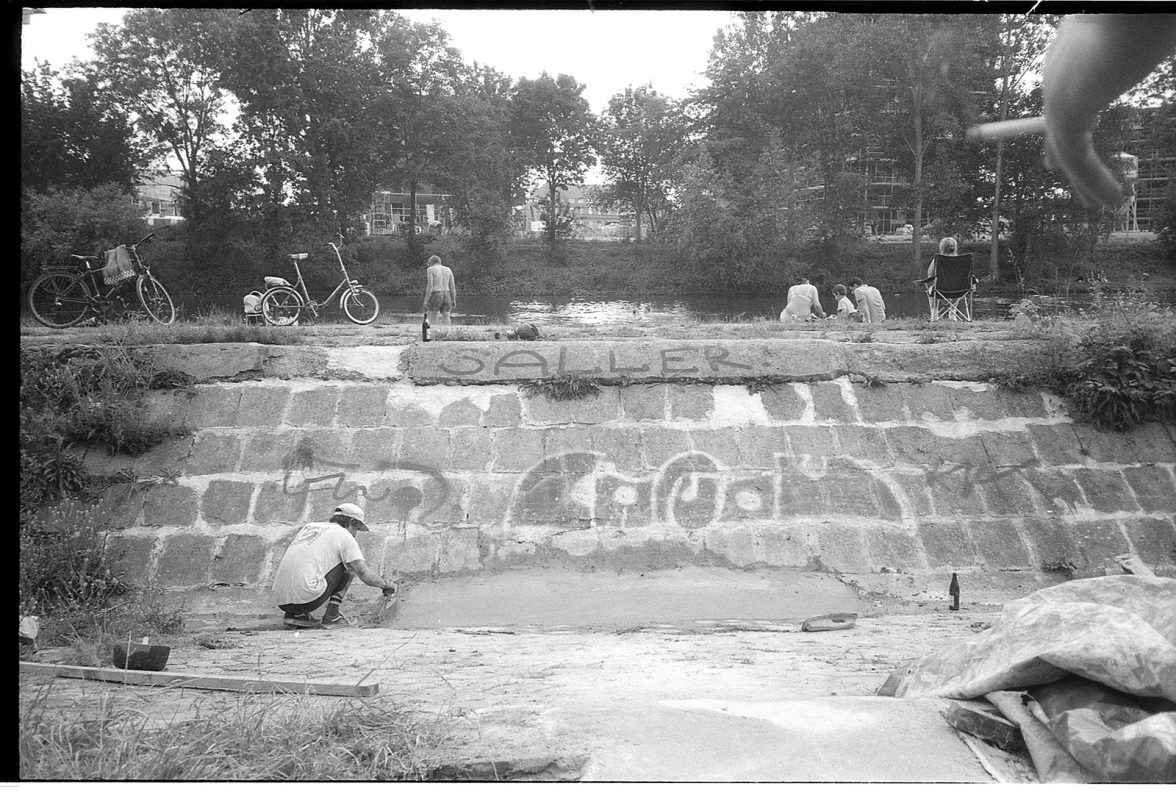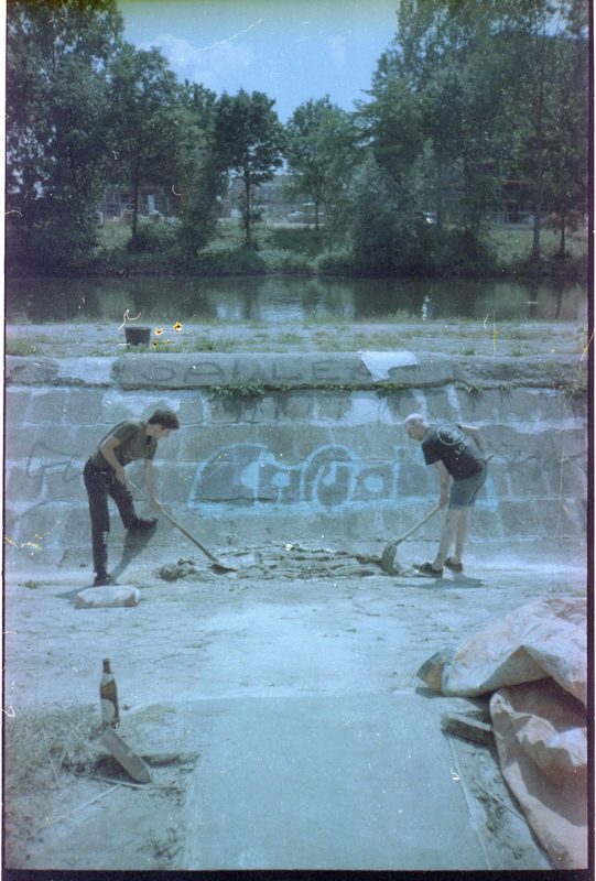 This year we discovered a tight and steep ditch close to the swimming spot. Some friends and bmx riders already cleaned a little part of the ditch and filled some cracks, but it was still barely possible to ride with a board. We saw the perfect chance to continue on what they began with some basic concrete work.