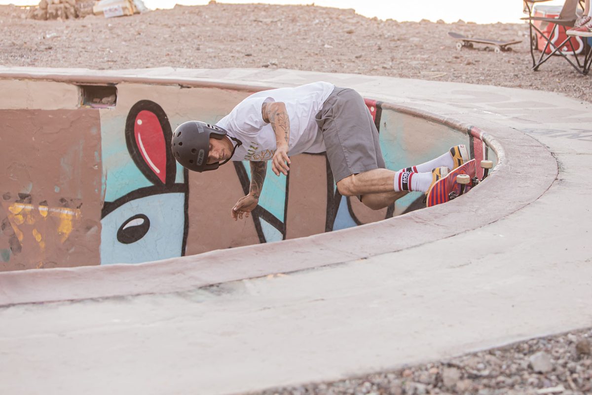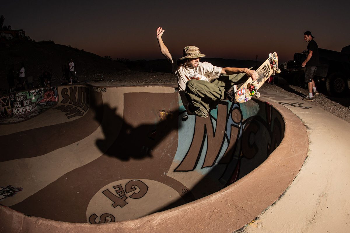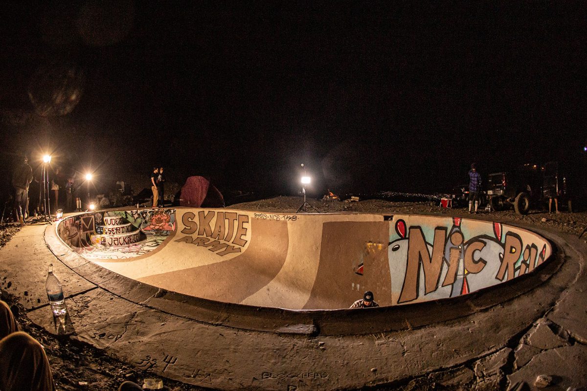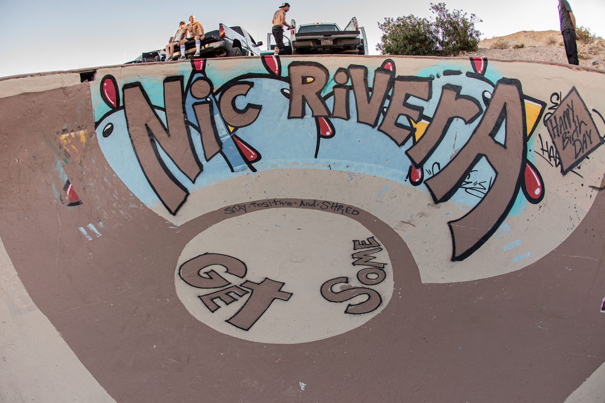 Named for its original placement at a 1960s/1970s nudist resort in the remote desert just outside of Palm Springs, the Nude Bowl has been buried, dug up, and restored a number of times over the last 20 years after the resort owners abandoned the property. The one responsible for the most recent 3-day excavation and restoration back in 2014 is Rodney Rodrigues (aka, The Skate Saint), and he just so happened to be in attendance at Nic‘s birthday session. Prior to Nic‘s arrival, Rodney graciously patched and repainted the pool with a special birthday tribute to Nic.