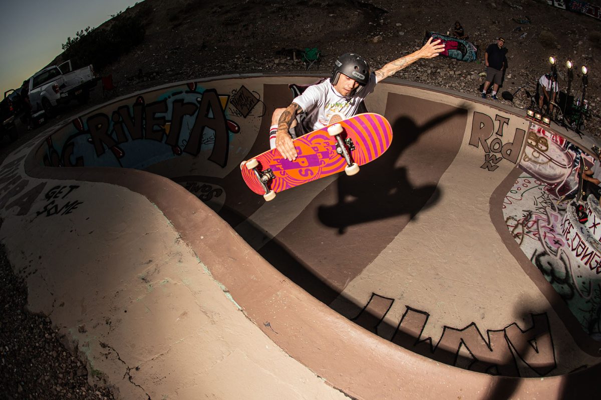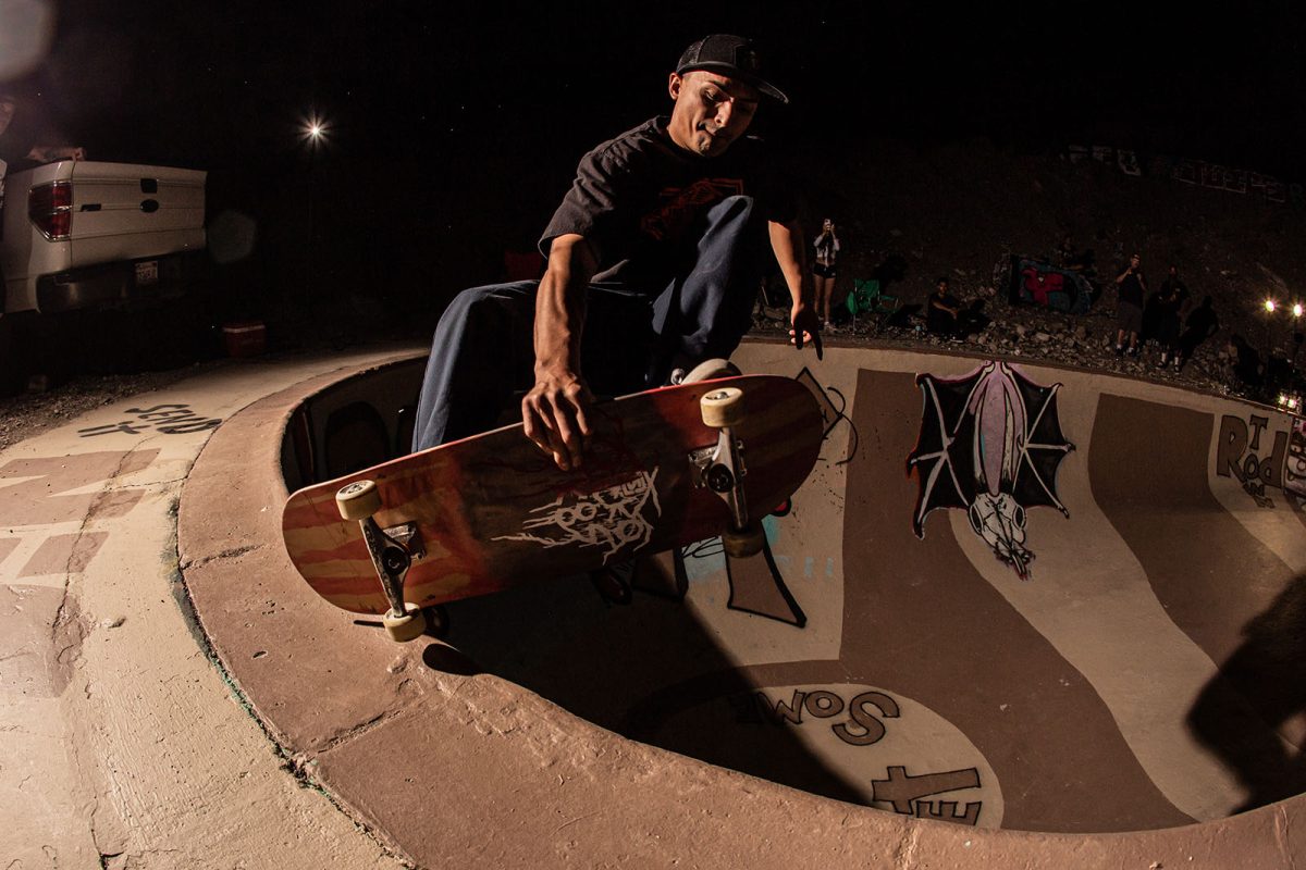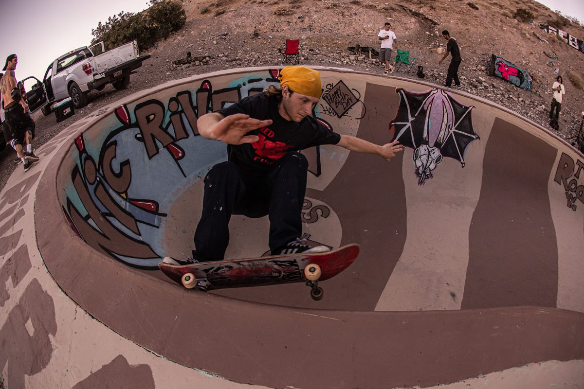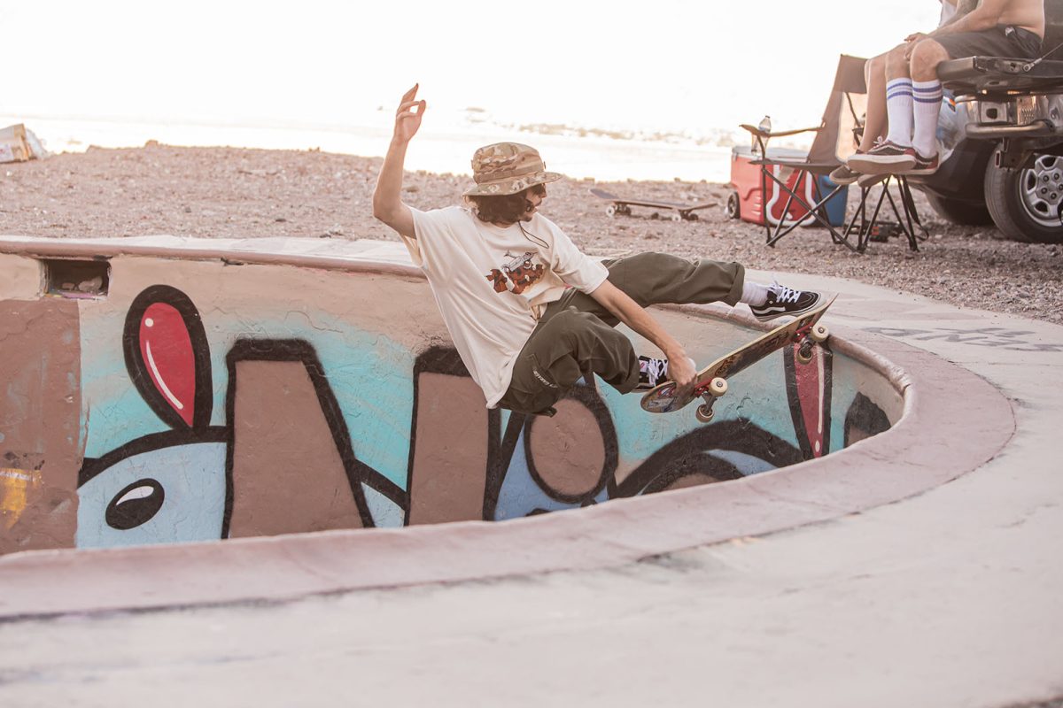 Several floodlights were set up to illuminate the pool while the night skate session continued. SoCal shredders like Andiey Lerma, Sean Plundeke, and Eric Hutchinson rotated in and out of the pool with Nic Rivera to pull off gravity-defying tricks you just don’t see everyday. As the night wound down, the group retreated to their tents, backseats, and pool-bottom sleeping bags to sleep off the beers, bruises, and session stoke.