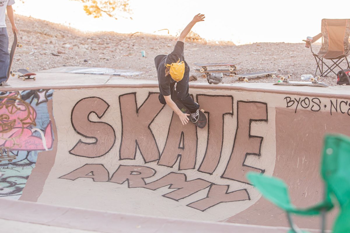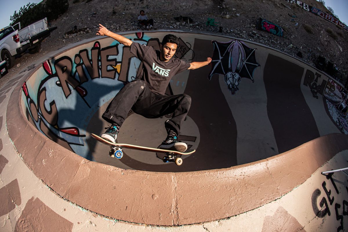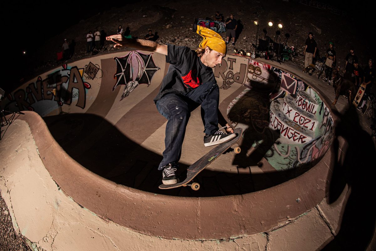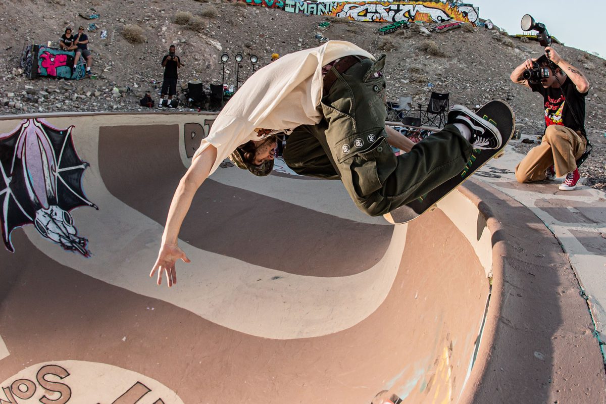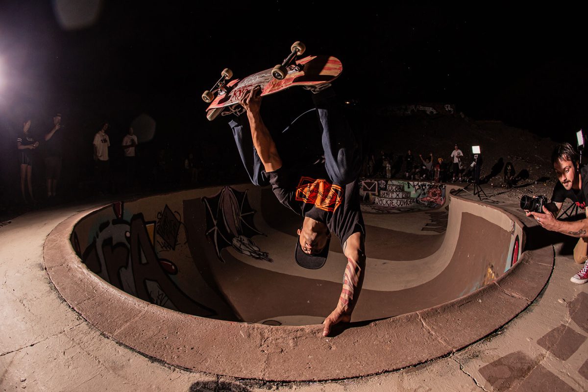 Several floodlights were set up to illuminate the pool while the night skate session continued. SoCal shredders like Andiey Lerma, Sean Plundeke, and Eric Hutchinson rotated in and out of the pool with Nic Rivera to pull off gravity-defying tricks you just don’t see everyday. As the night wound down, the group retreated to their tents, backseats, and pool-bottom sleeping bags to sleep off the beers, bruises, and session stoke.
