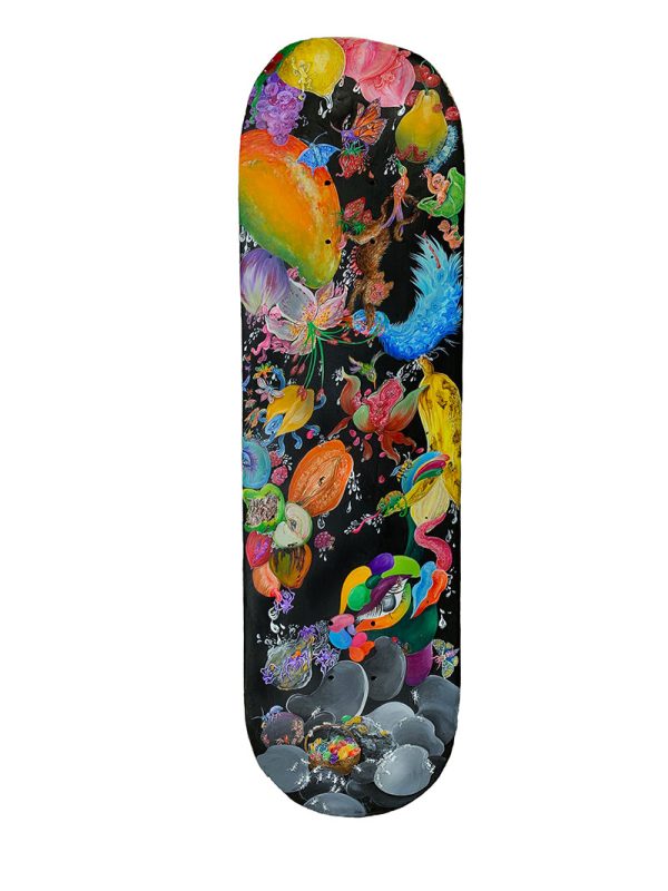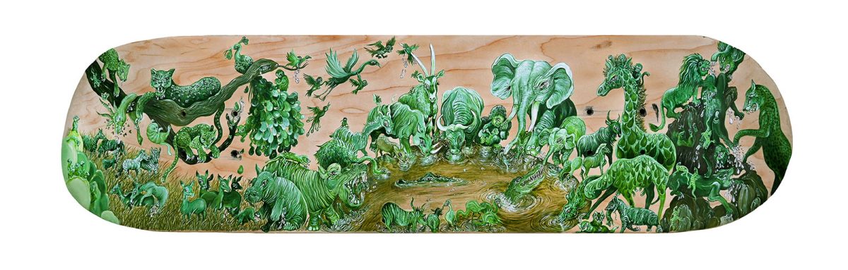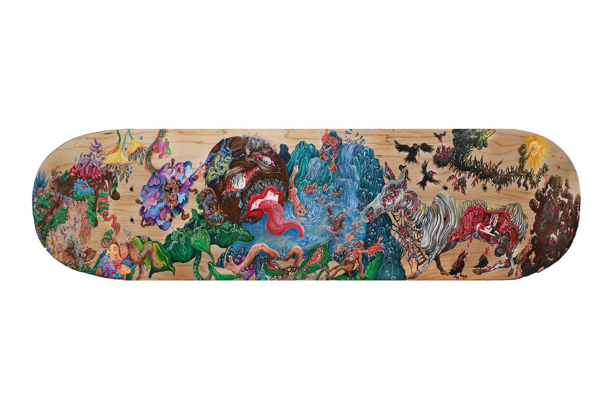 I turned to discarded skateboards to convey these stories. Objects of mobility that have taken me to many of the places that I have been inspired by and continue to return to. Objects that are sourced from college skateboard clubs, friends, etc, that express other people’s stories. Once discarded, they become objects with no visible map and capable of redemption. I began by sanding them down to resemble a blank canvas, retaining some of the original cracks and burrs.
