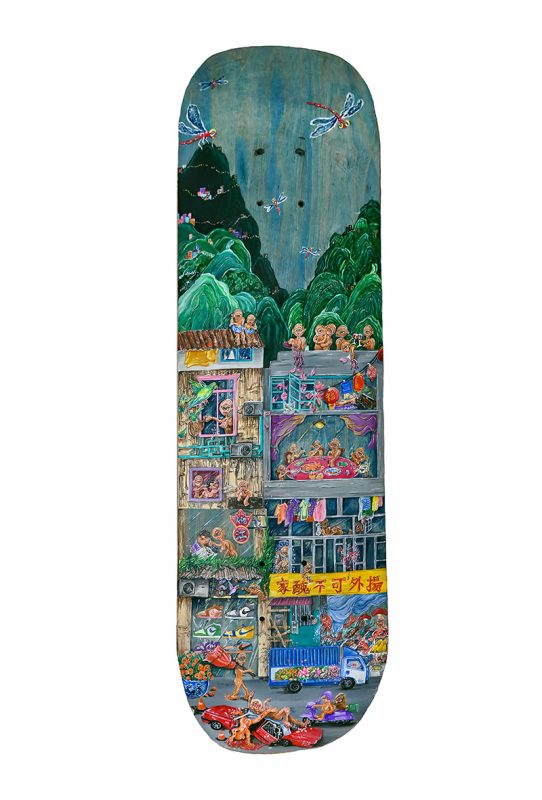 “Infinite Possibilities: Inside This One, There Is Another World” captures the intensity and claustrophobia of life in Hong Kong. Typical scenes with twists, depicted as if on a hanging scroll, spill over and even blend into one another. The confusion and multiplicities annihilate any sense of self. The open sky is a counterpoint to what happens below. The mountains also offer respite from the exhausting minutiae and rhythm of city life. So much of life in Hong Kong happens on the inside but I’ve spent most of it standing on the outside trying to capture it.