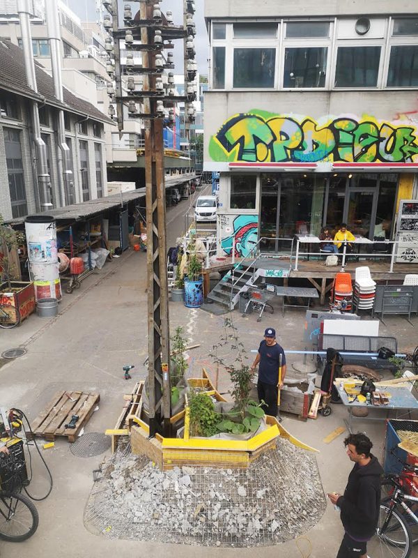 The concrete, the screws and the reinforcing mesh were bought, the rest is gathered on the site and reinstalled. The demolition material from the installation of the cafeteria windows was used to backfill the concrete element. Of course, it is also one of the most elegant bases that an old telephone pole has ever received. Until recently, it served the houses around Limmatstrasse in Zürich and stood on the site of the now demolished School of Design.