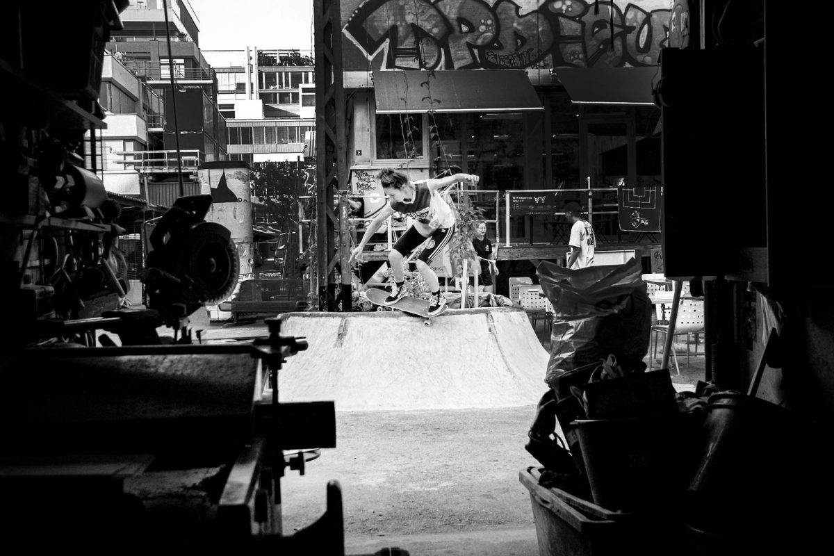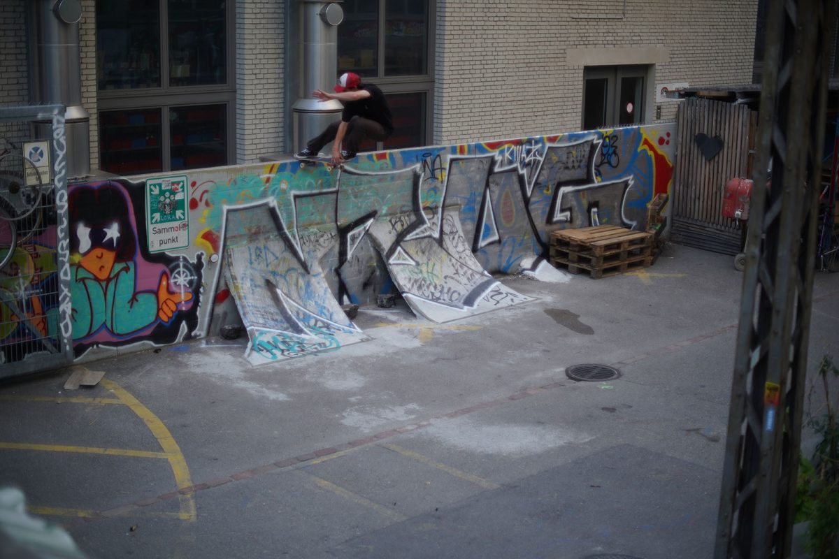 The concrete element stands on an asphalt square visavi two wallrides, different workshops and the cafeteria of the cultural space ZW on the site of the former central laundry of Zürich. Now an interim use.
