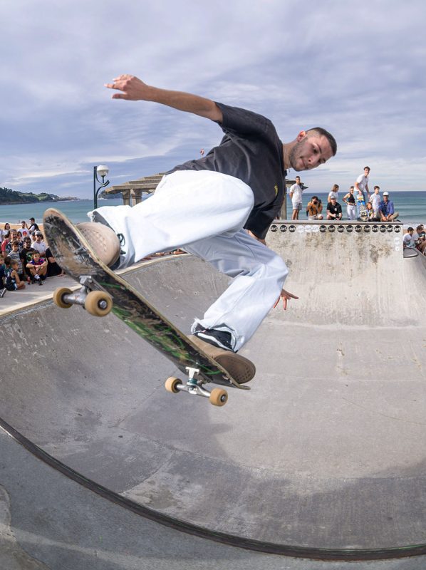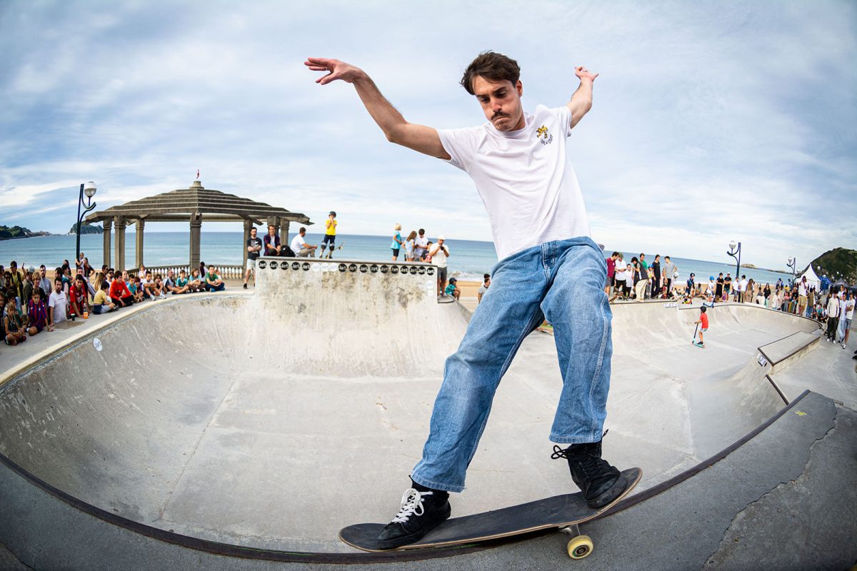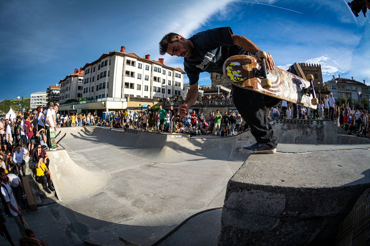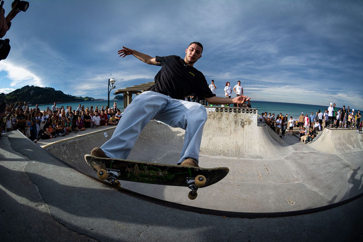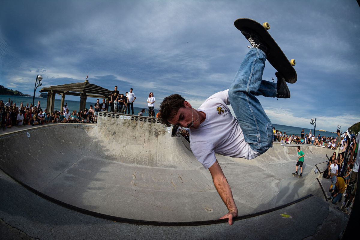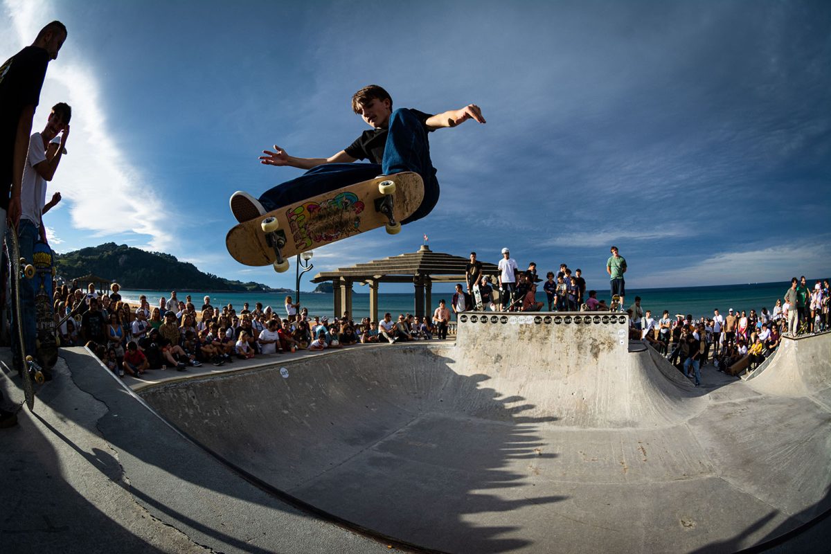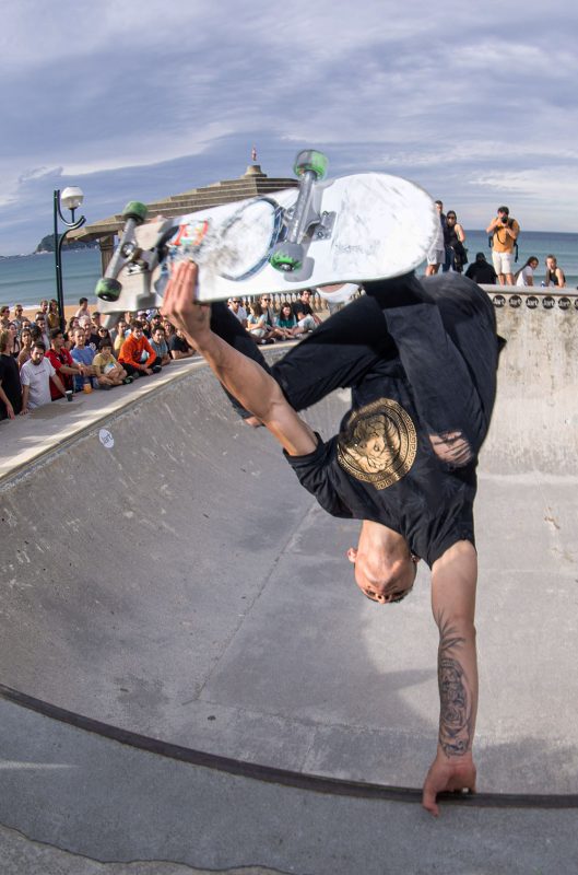 Cruzade Skateboards put on a cash for tricks session at the concrete ramp/bowl on the beach in Zarautz, Basque country during the Zarautz Pro surf competition.
