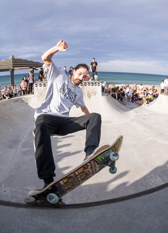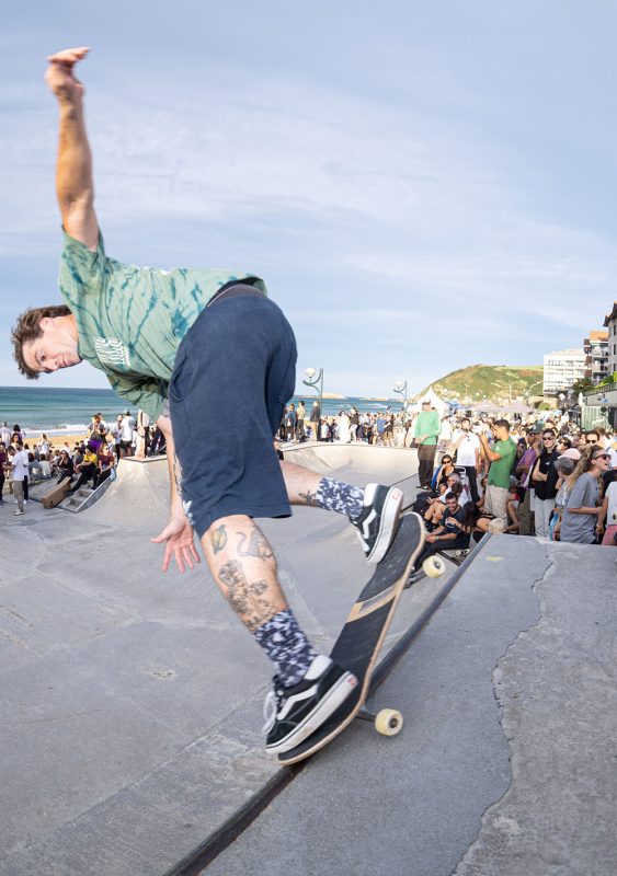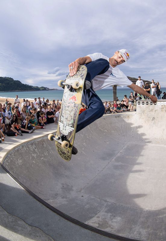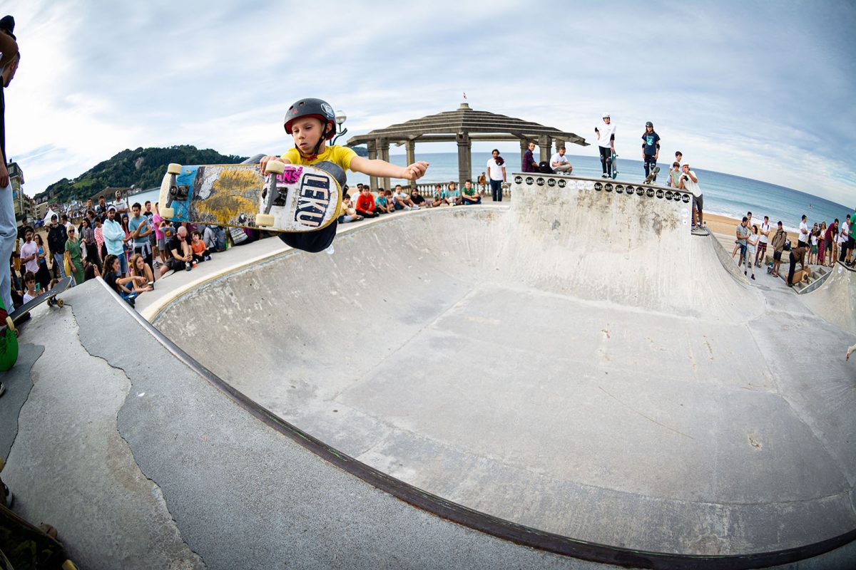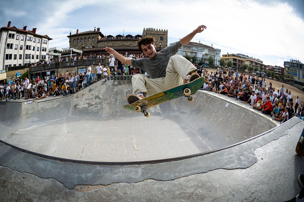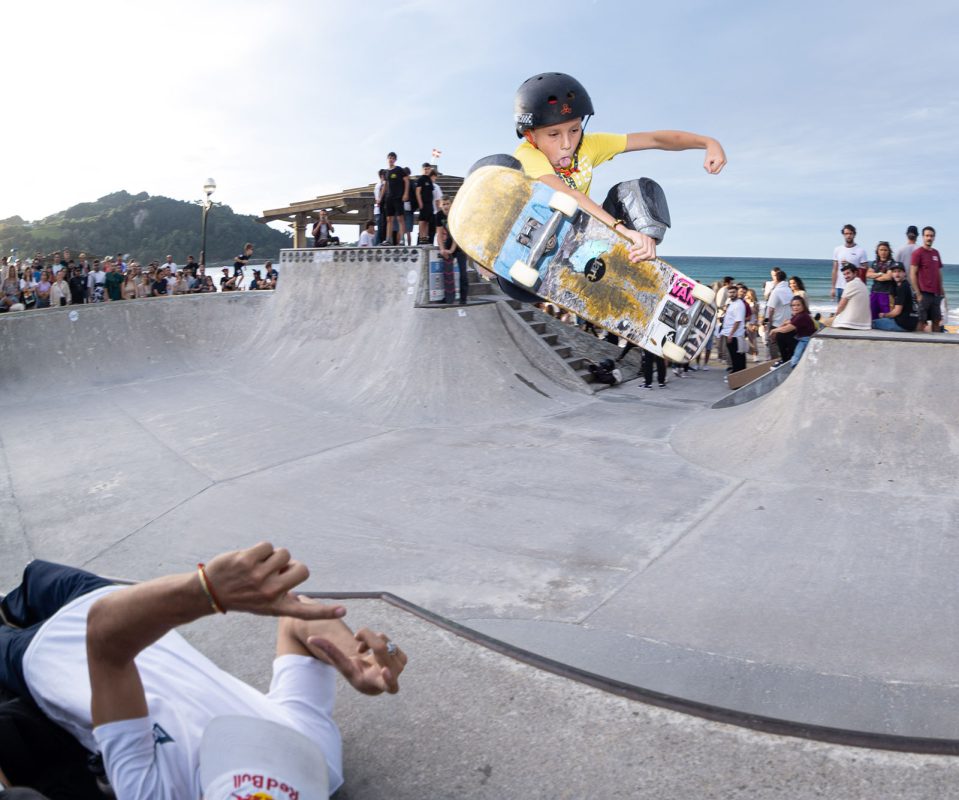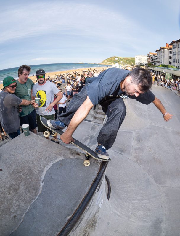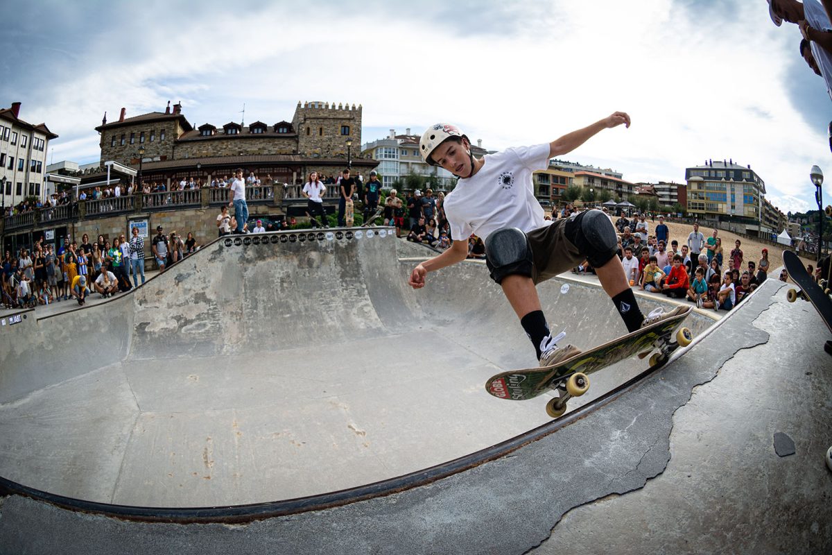 Cruzade Skateboards put on a cash for tricks session at the concrete ramp/bowl on the beach in Zarautz, Basque country during the Zarautz Pro surf competition.