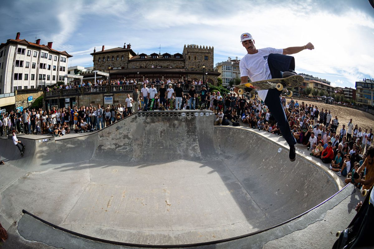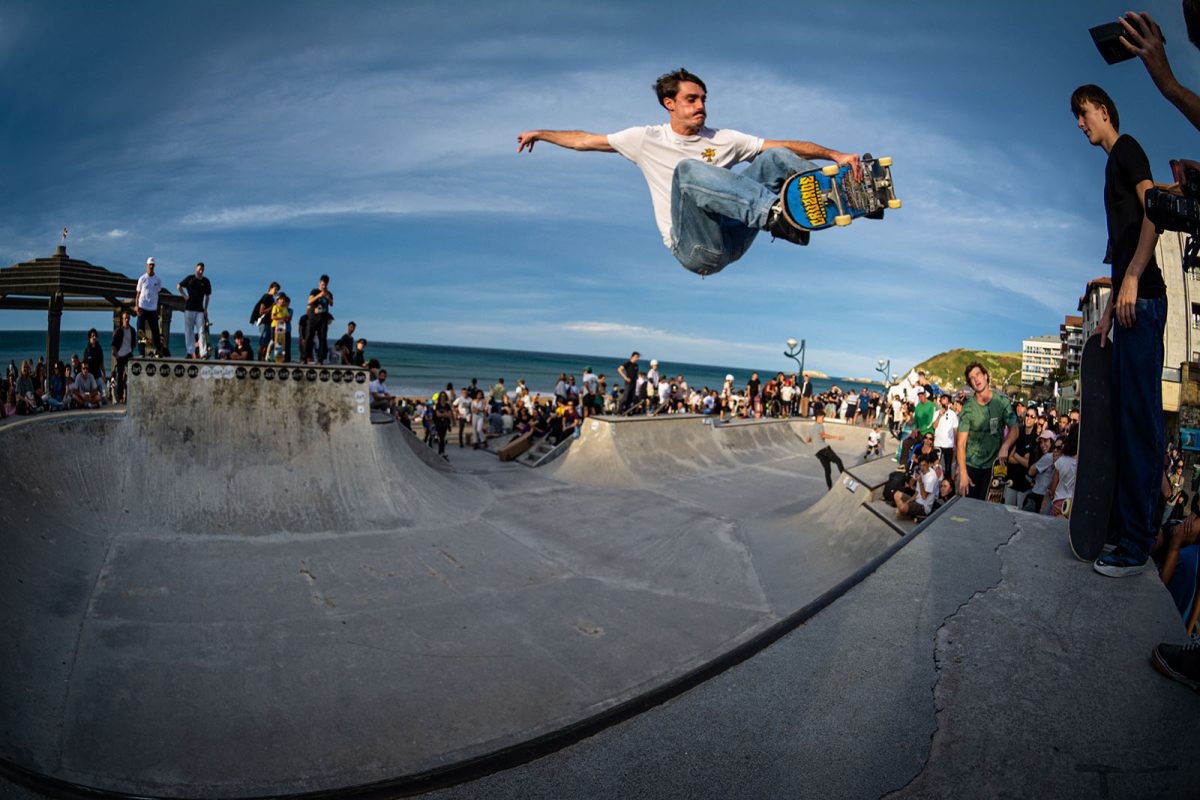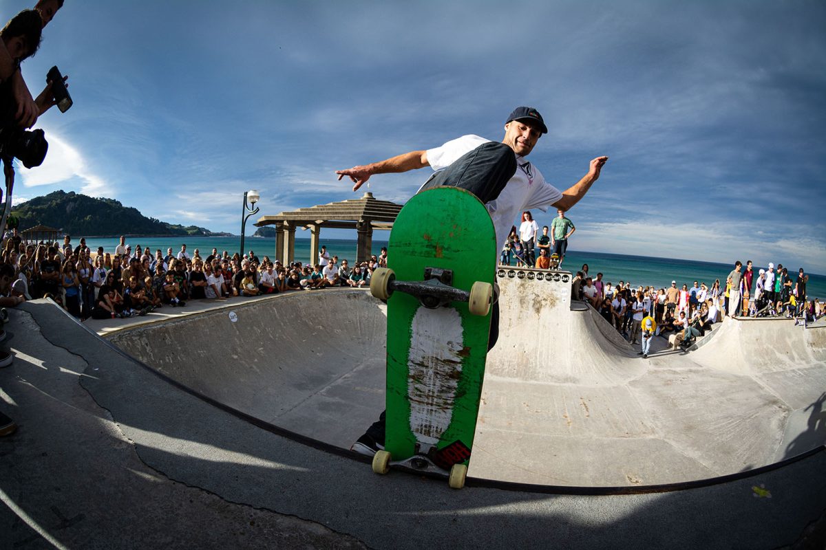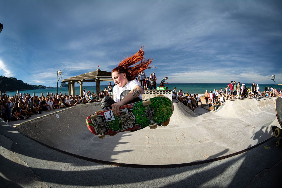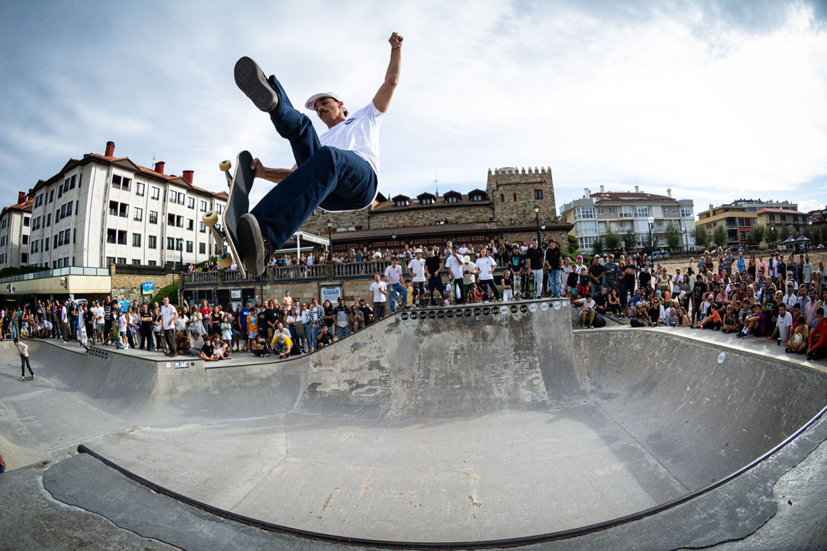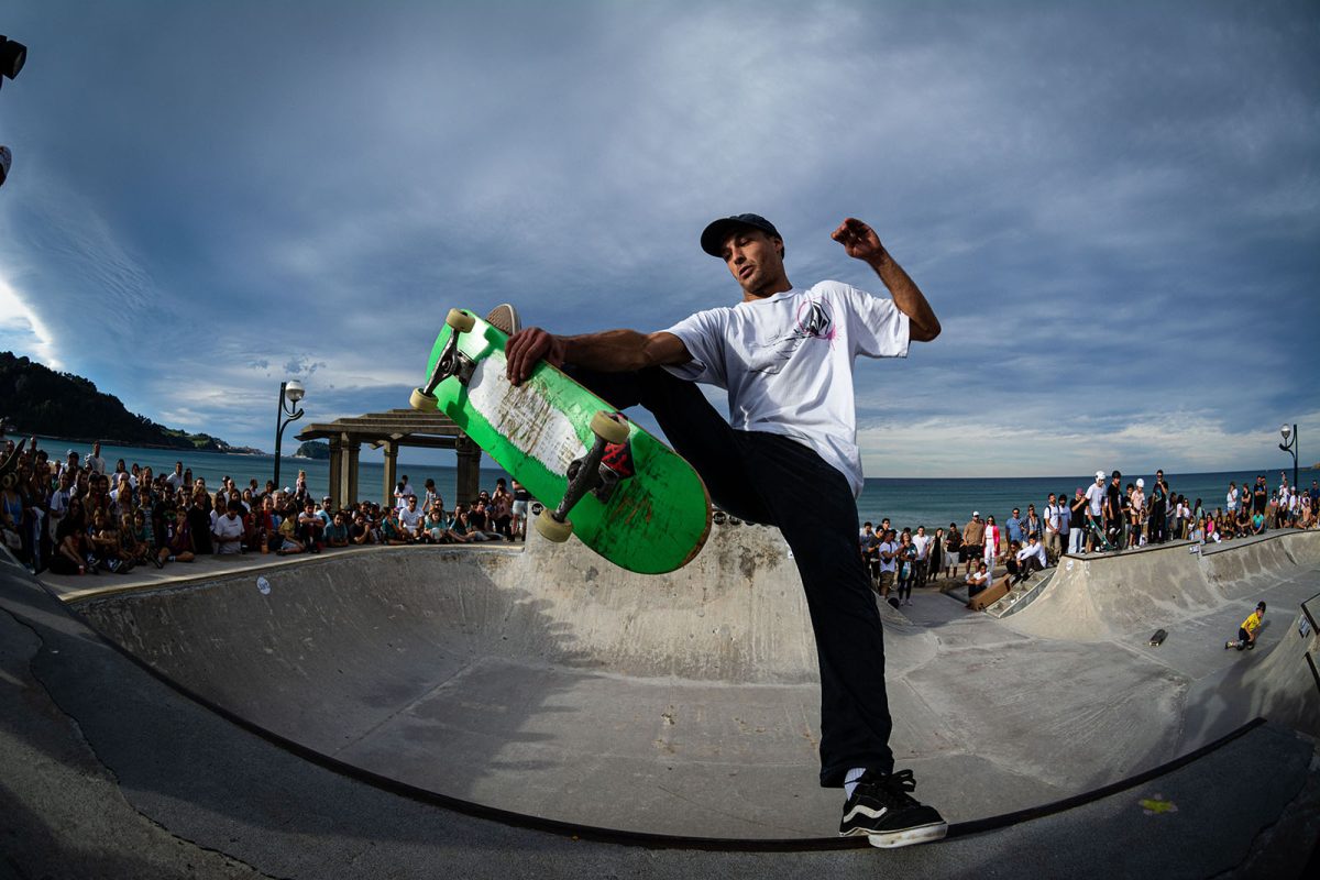 Cruzade Skateboards put on a cash for tricks session at the concrete ramp/bowl on the beach in Zarautz, Basque country during the Zarautz Pro surf competition.