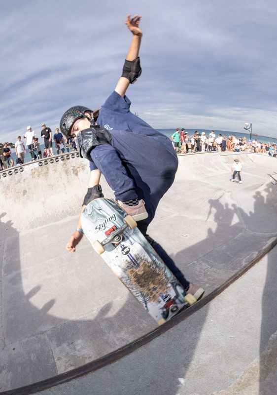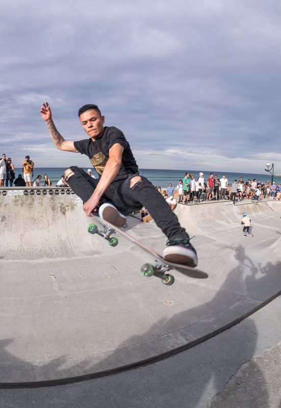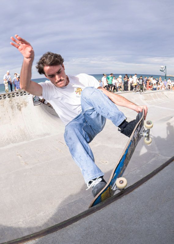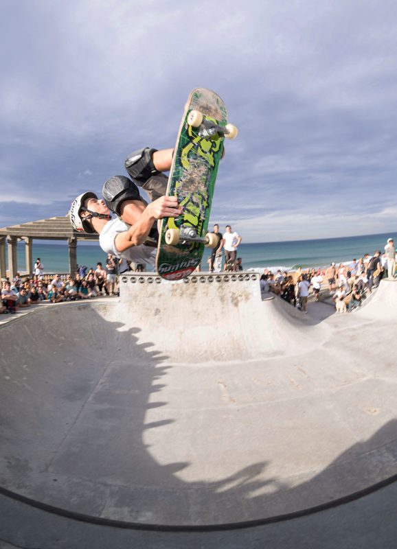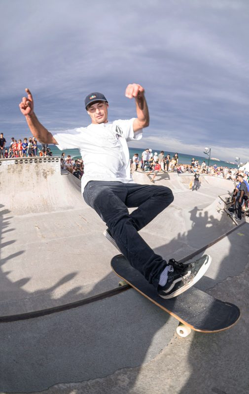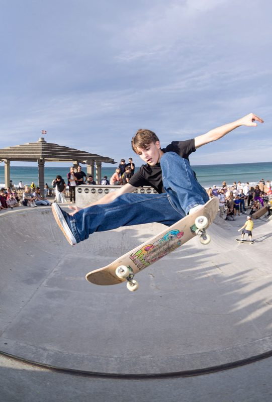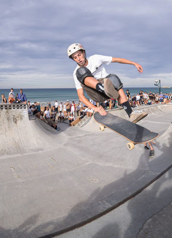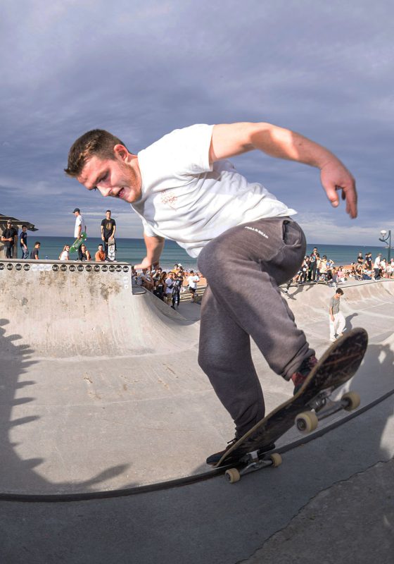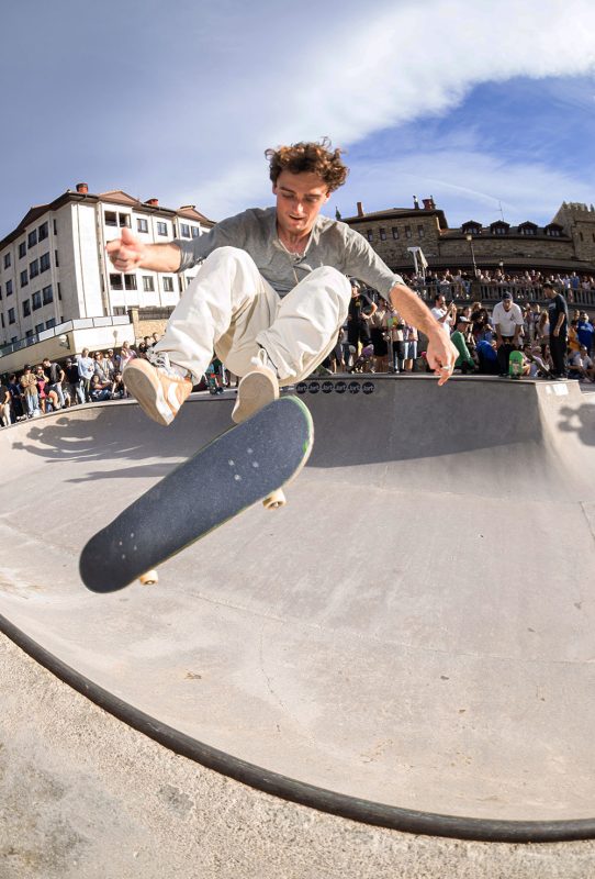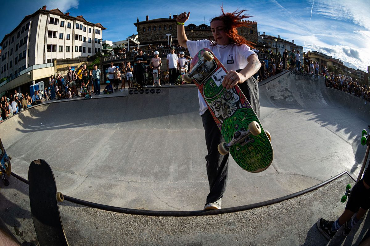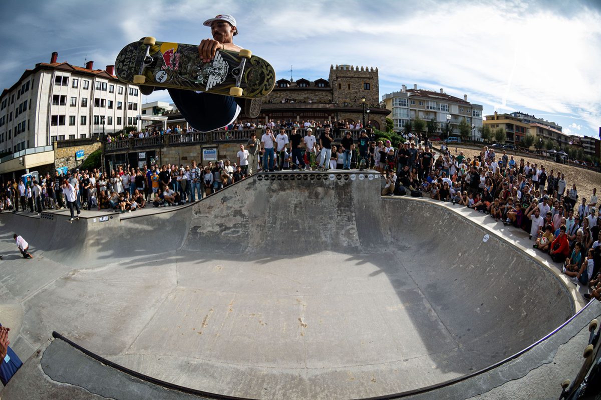 Cruzade Skateboards put on a cash for tricks session at the concrete ramp/bowl on the beach in Zarautz, Basque country during the Zarautz Pro surf competition.