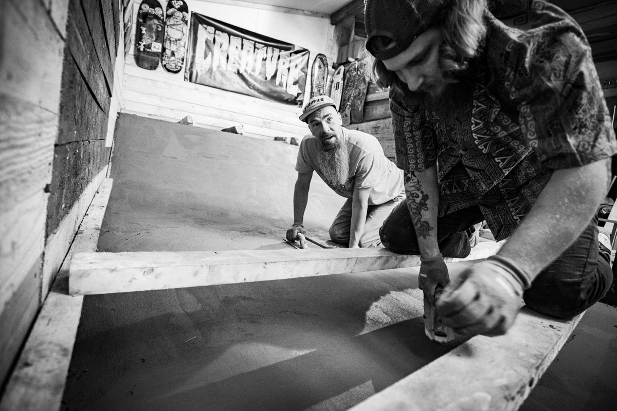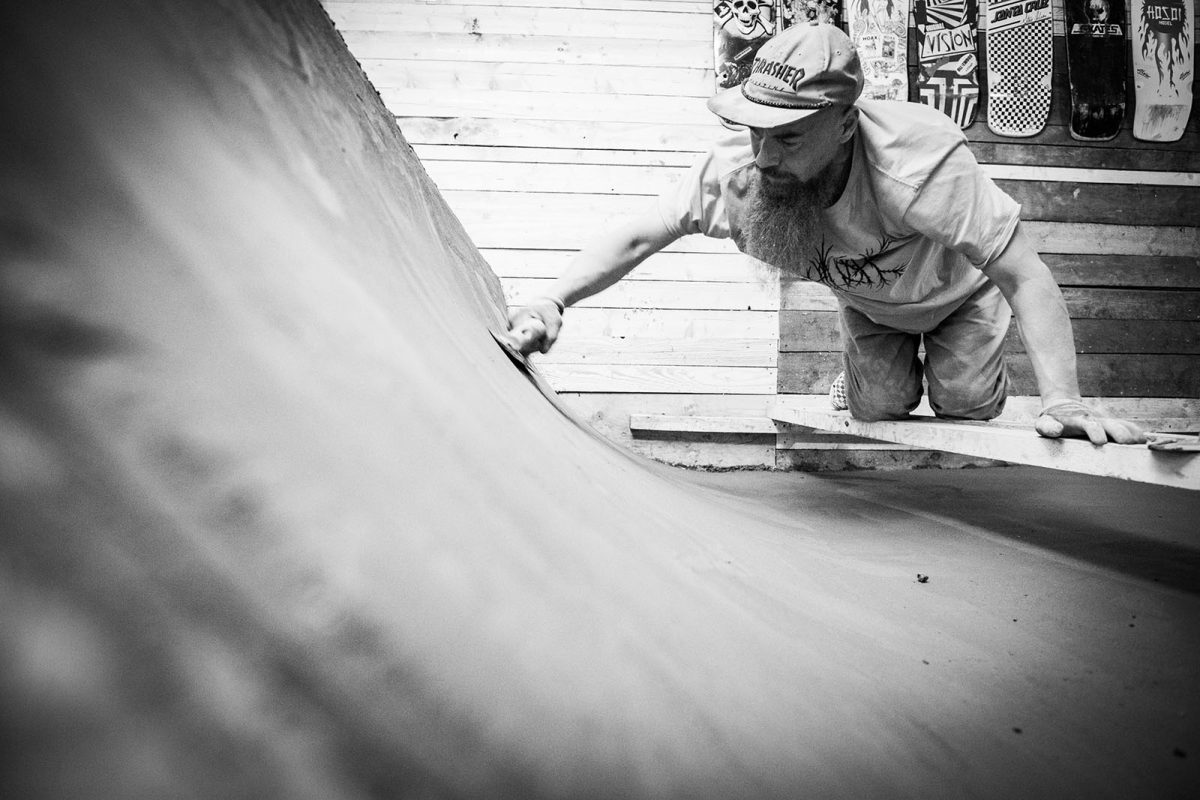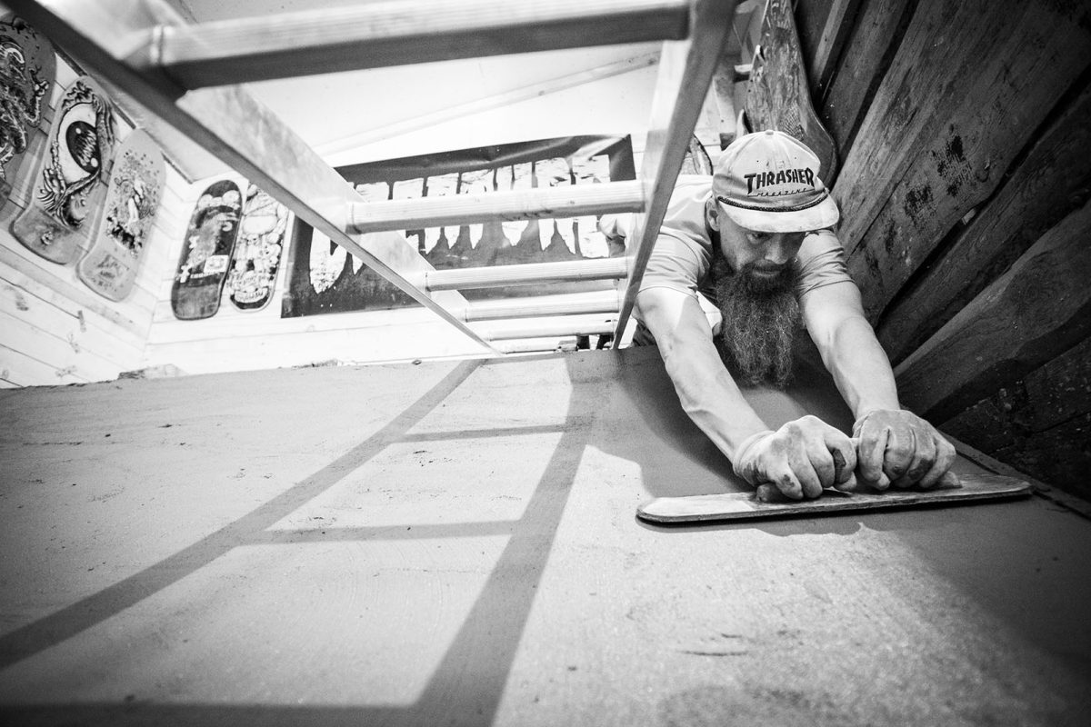 End of June, Maksy took a 2-day trip to Estonia and after one night of no sleep because of the stress, and also my non-stop screaming cats, 6.30 in the morning the ‘crete-truck was in the back street and the pour ready to start. Took hell of a long hard day, with extra help from Jaagup, young local, super enthusiastic and skilled friend. We managed to do both transitions and flatbottom. We learned so much in that day, thanks to Jani’s professionalism! He’s a concrete master and always loves to share his tips etc.