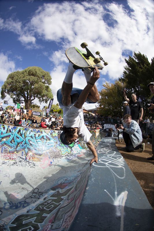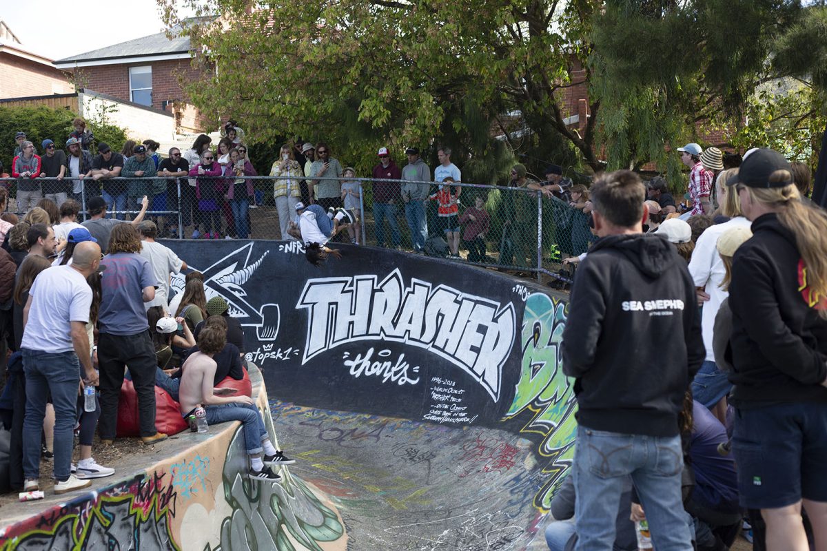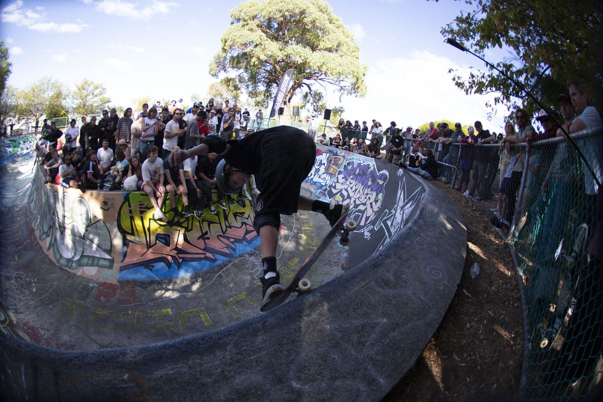 This year kicked off with a pumping opening party with a photography show by yours truly at Hobart’s newest and freshest boutique store Concept On Criterion, which drew OG Tassie skate heads out of the woodwork. Despite some dusty heads the next day the Bowl Jam kicked off around noon with the eager groms getting some, followed by an “all in” in The Bowl. Shit got heavy when Ramp Wizard brought their obstacle to the show and the crew stepped up! Everyone skated hard, shredded some skin, sweated buckets and then it was on to the final event… The Thrasher wall! The line into this spot is mean, the angles obscene and the speed that shoots you in to the bowl is deadly. To put it into perspective the ABDs are only now being written on this lip 40+ years later…
