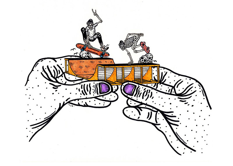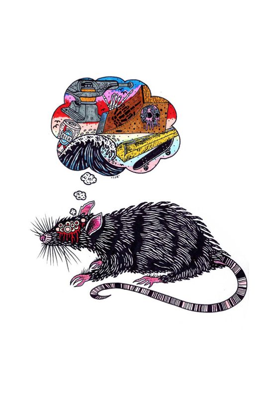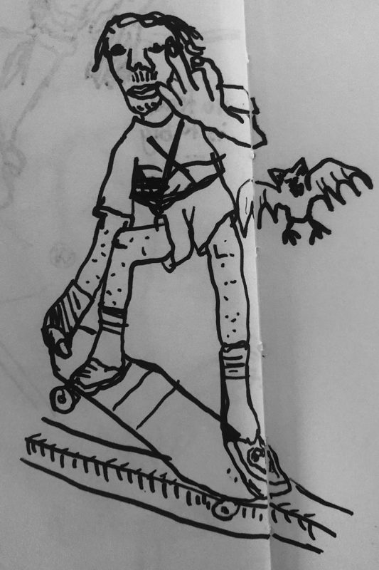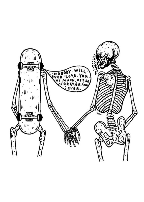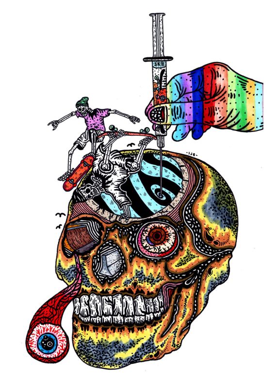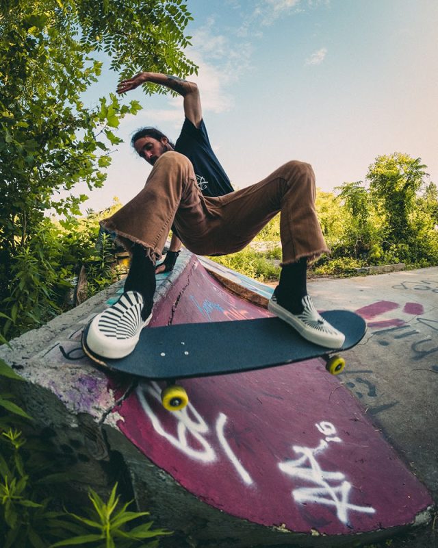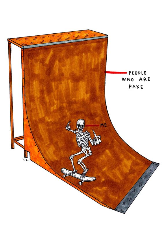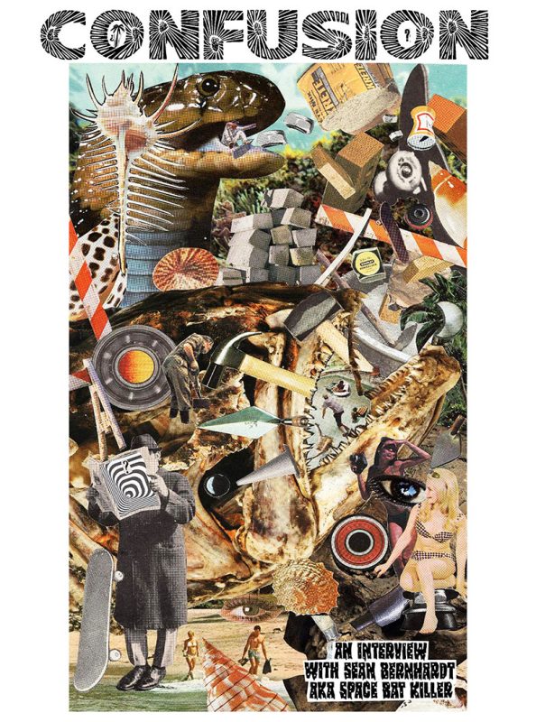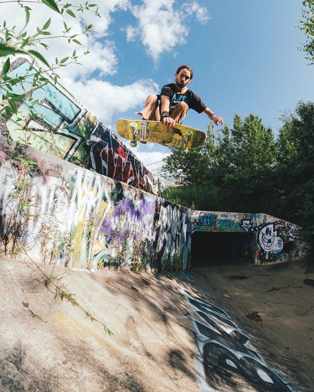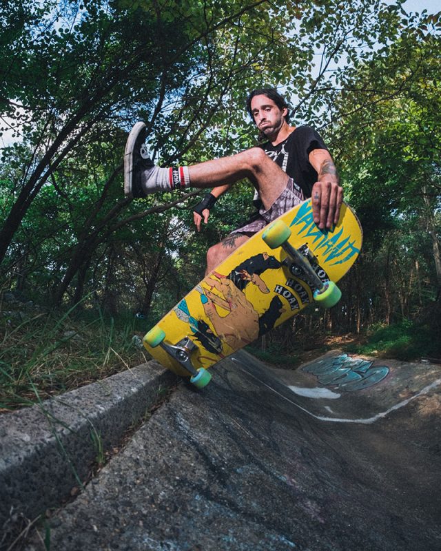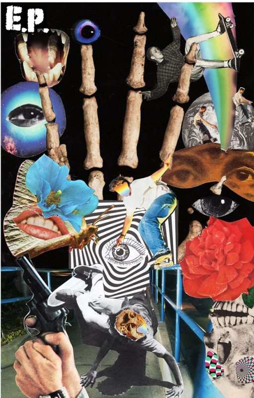 Skateboarding is my second form of art as well! It’s a hobby, but the feeling I get from skateboarding is that equal love (same as being stoked on a collage or drawing after a day in the studio) – some of my favorite tricks I do often in and out of ditches – boneless, 360 boneless, nose pick, dump-truck, frontside tail-slides always.