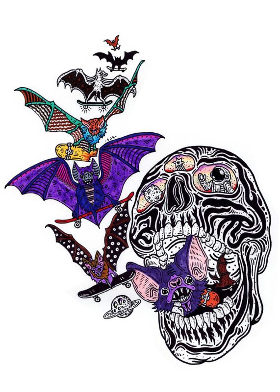 The name Space Bat Killer originated from a painting made on one of my old surfboards. I’ve always liked Thee Oh Sees album “Help” which has a bat on the cover. Over the years I’ve actually drawn a few different pieces inspired by that album art (they’re one of my favorite bands too by the way).