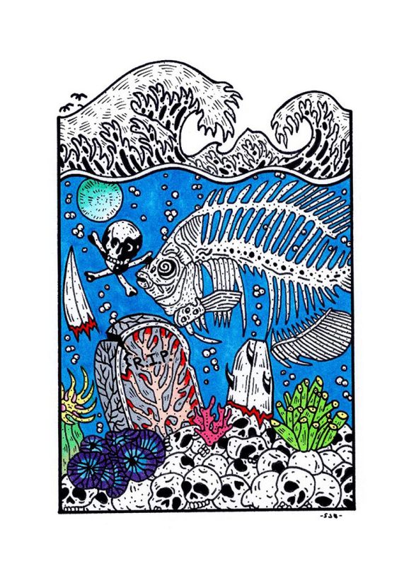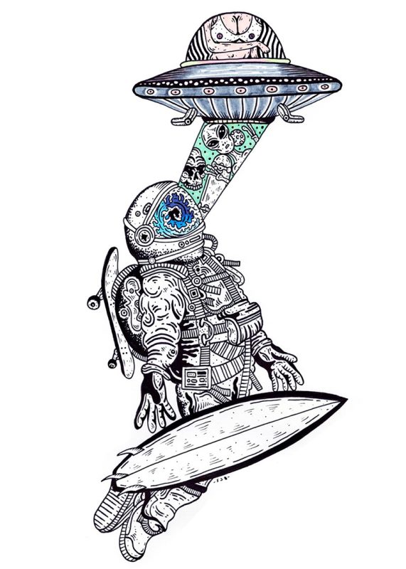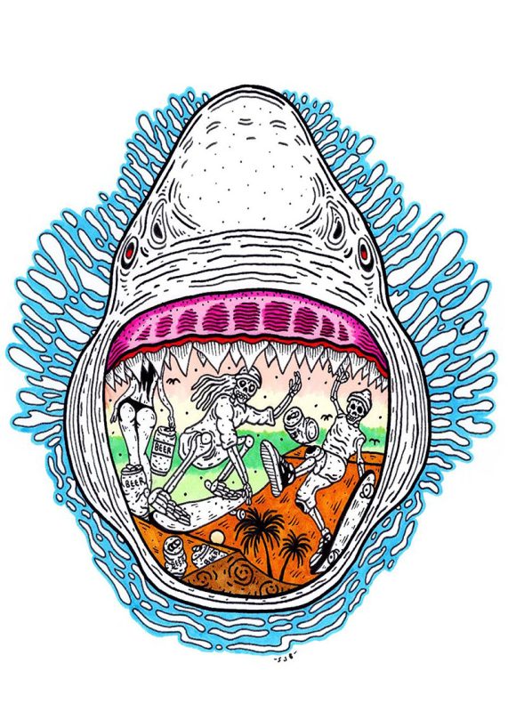 When I am making my collages it’s a lot more all over the place. Usually my pen and ink stuff I have the idea or slight concept in my head before I make it. A lot of the drawings are inspired by songs, dreams, skate, surf, dark beach. I work similar to how tattoo artists work when using markers… like rough trace, then ink. I use a light box a lot for my drawings. I got my work in a ton of local shops and had my first solo show in Asbury Park, NJ. Pretty much since that time (soon after school) was when I started working on my style and experimenting with different mediums. I work with a lot of brands/clients who let me jam on concepts or ideas. Usually the end result comes out better than I expect.