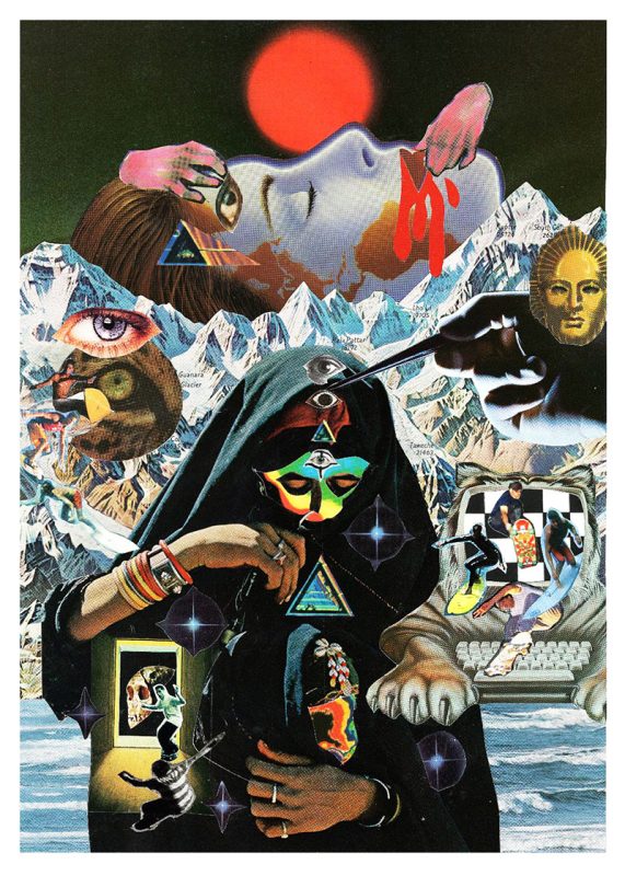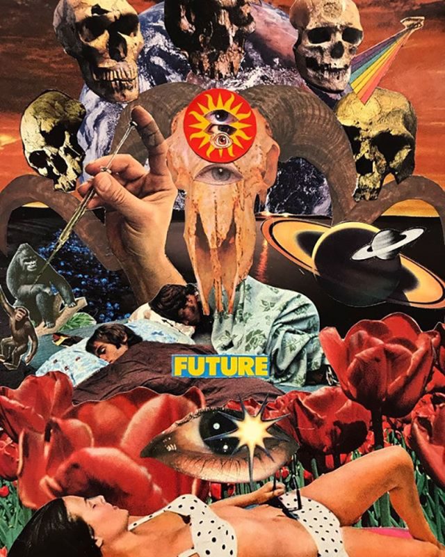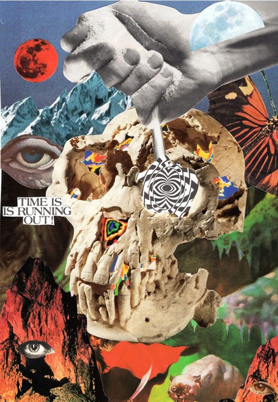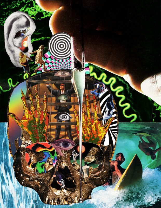 Some of my favorite things to draw are skull heads, all seeing eyes, palm-trees, animals, water moving (ocean, surf, beach related scenery incorporated into pieces), skateboards, open mouths. I usually will find imagery and rough trace/sketch out my twist on subjects and then ink them with my lightbox (I work very similar to a tattoo artist with all my drawings). When collaging my favorite stuff to use – old surf/skateboard mags, books related to wildlife/nature, old Nat-Geo (I have stacks and stacks of these) and Omni magazine I use often. Early 70’s-90’s imagery catches my eye the most, I look for brighter colors, psychedelic backgrounds/landscapes, animals likes snakes, tigers, bats flying etc. that are fun to play around with.