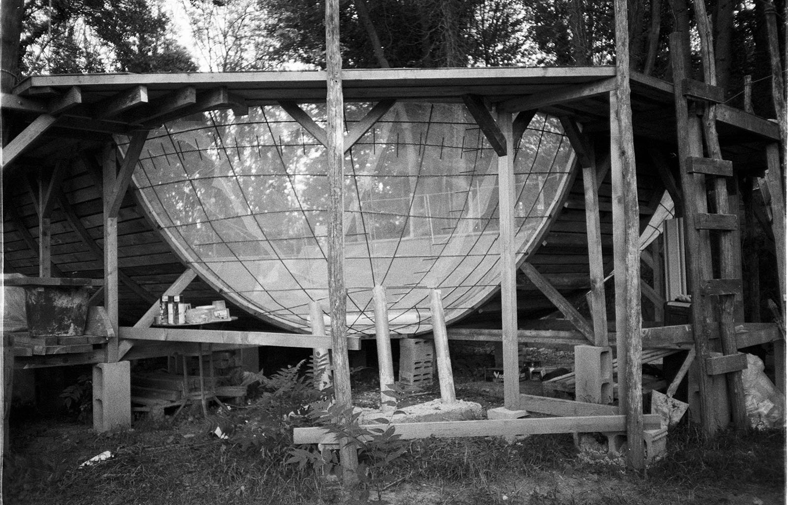 The main part of the building, the wooden straight mini ramp, took three weeks and then I kept on working on it every now and then in my free time. I finished the decks, the curved coping and then we tried this experimental way to pour a fill free corner and hip without using any wood underneath. To get some money for the concrete, we started a gofundme that went pretty well, a lot of friends from all over Europe put some money in and we were able to collect more than a 1000 euros, which was actually all we spent for this last phase. We poured some support columns and then a first rebar net which had on top a really thin net made for plaster walls. Then we continued by doing a thin plaster layer which then ended up being the box to pour the actual concrete inside. All the rebar job was welded to some metal plates attached to the wood transitions of the mini ramp to make it all well connected. The concrete is really thin but with cotton fibres in the mix that prevent it to crack even being 5-7 cm thick, and it’s been dyed in brown with pigments to make it look like a wood panel.