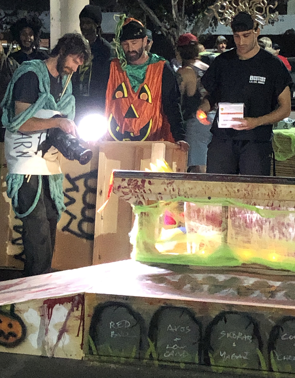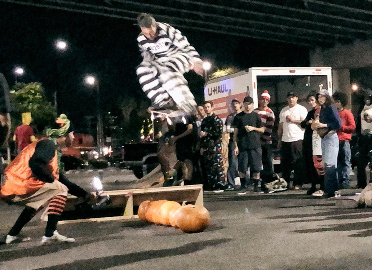 Tradition came calling in the form of the pumpkin jump. Participants threw themselves over before they capped it at thirteen, inevitably smashing the survivors. After two brave souls climbed atop the moving truck to careen down the ramps, the night came to a close with the product toss, with Santa assisting. And what keeps the LTL crew coming back to wrangle this insanity every spooky season?