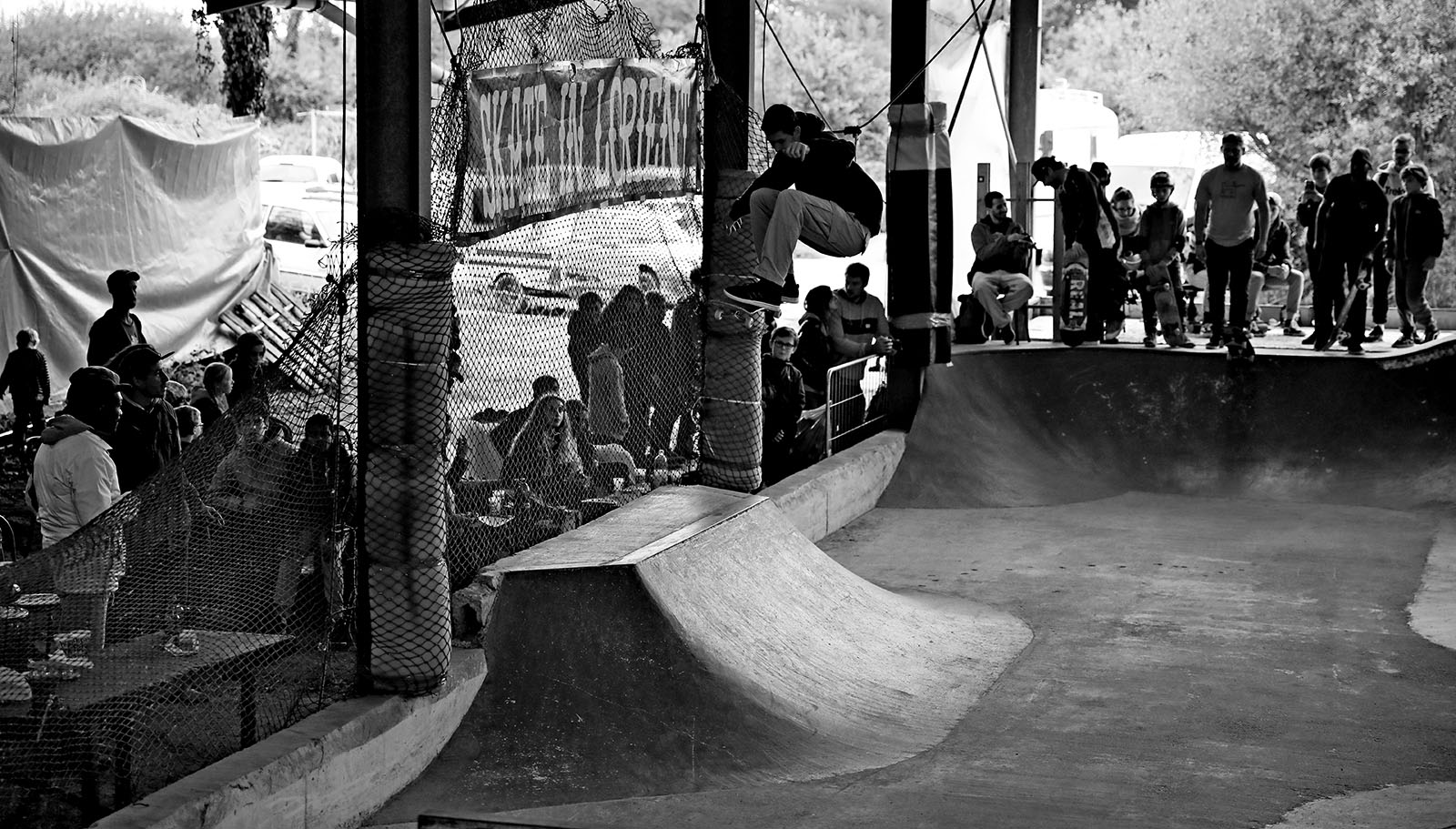 “It all started in 2018 with a group of handy friends, with the constant idea in the back of their heads of building a pirate DIY. After looking for many different spots, we started squatting this old barn, which at first was pretty much a total wasteland. But, there was a perfect concrete slab and a roof on top of it! We loved it straight away! It took us a few months of cleaning and night missions to “find” some materials on the construction sites around… Finally, once it was built, we started to organize some events, and it was on! “Skatebordel” ! (Local slang, meaning something like skate-mess- anarchy).