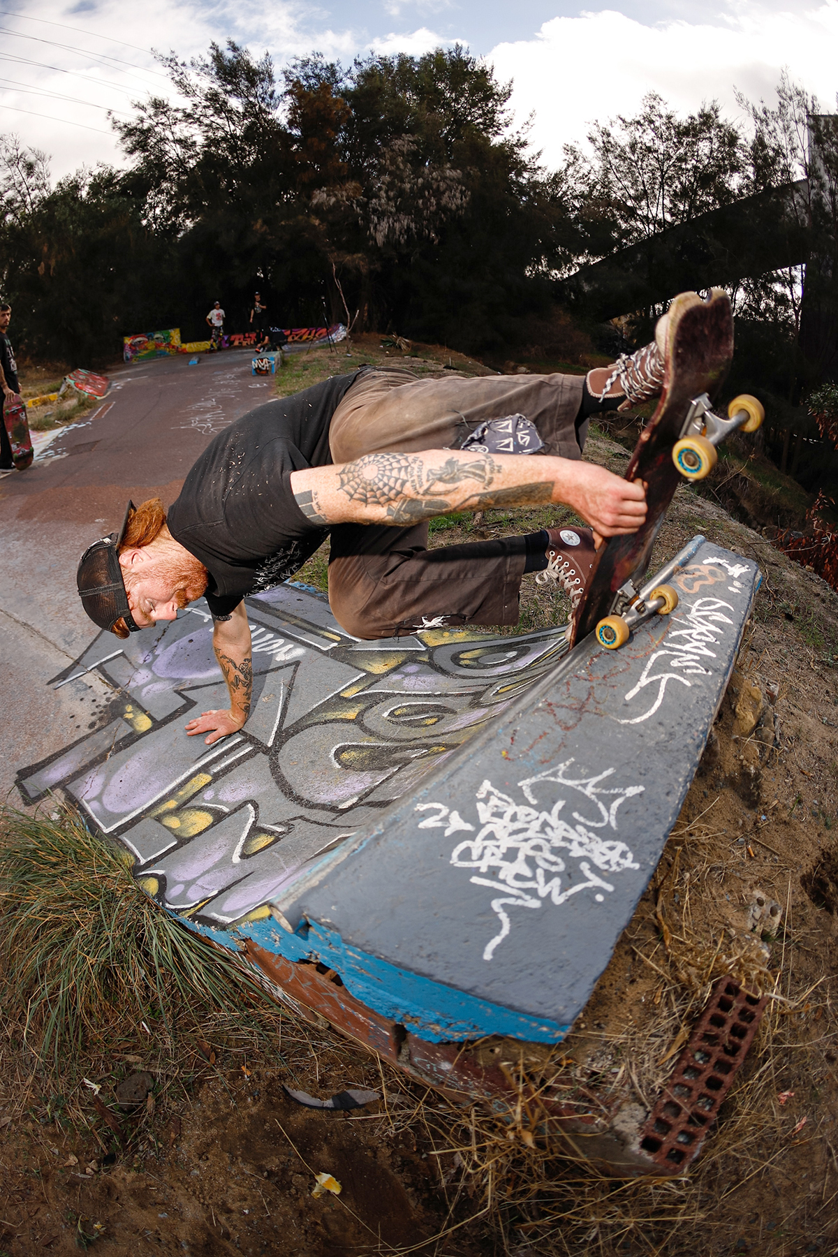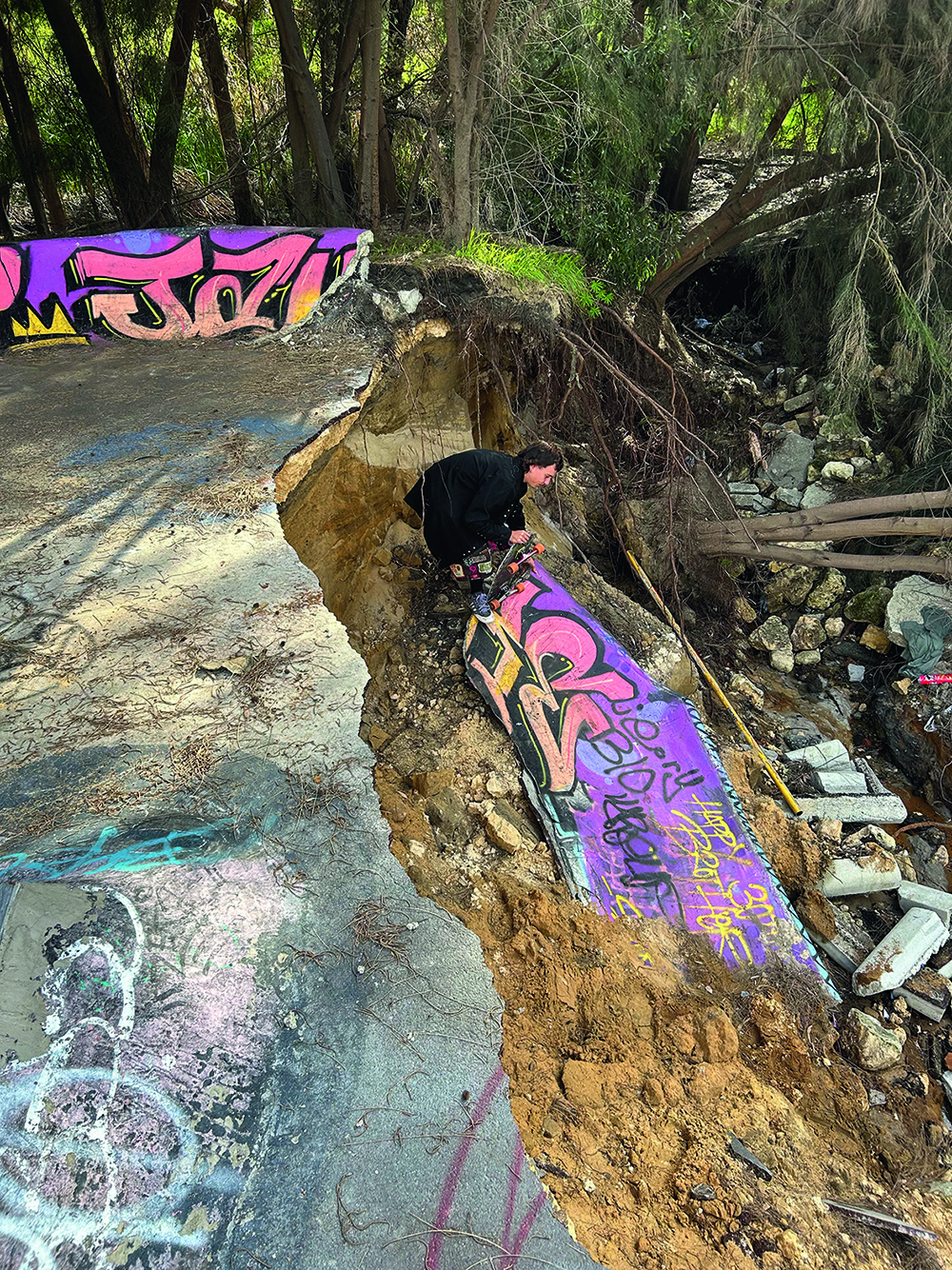 As of writing, there is an uncertain future ahead for our rickety little DIY – somewhat recently, roughly a quarter of the skatepark fell down in a landslide. Entire portions of the small quarter simply fell away – literally. There are talks of somehow incorporating this into the DIY, but a serious amount of concrete will be needed. More importantly, no one really knows exactly why it all fell to bits – we simply blamed it on a landslide, but is the whole park going to collapse? Is the power station next door sinking down into the Swan River, and taking our beloved shit hole with it? Will the powers that be see the landslide, and let the hounds loose to rip and rend apart all our creations?